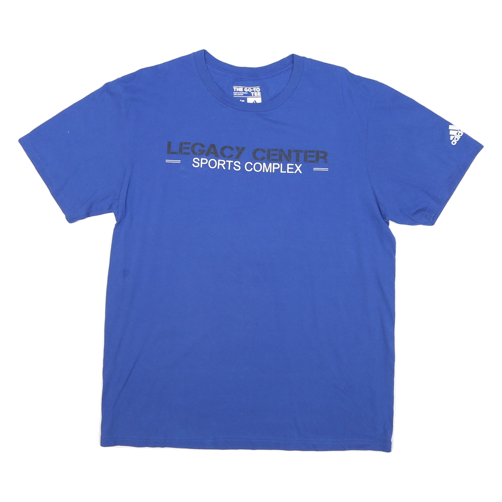 ADIDAS Mens Blue Graphic T-Shirt L Short Sleeve Crew Neck Legacy Center