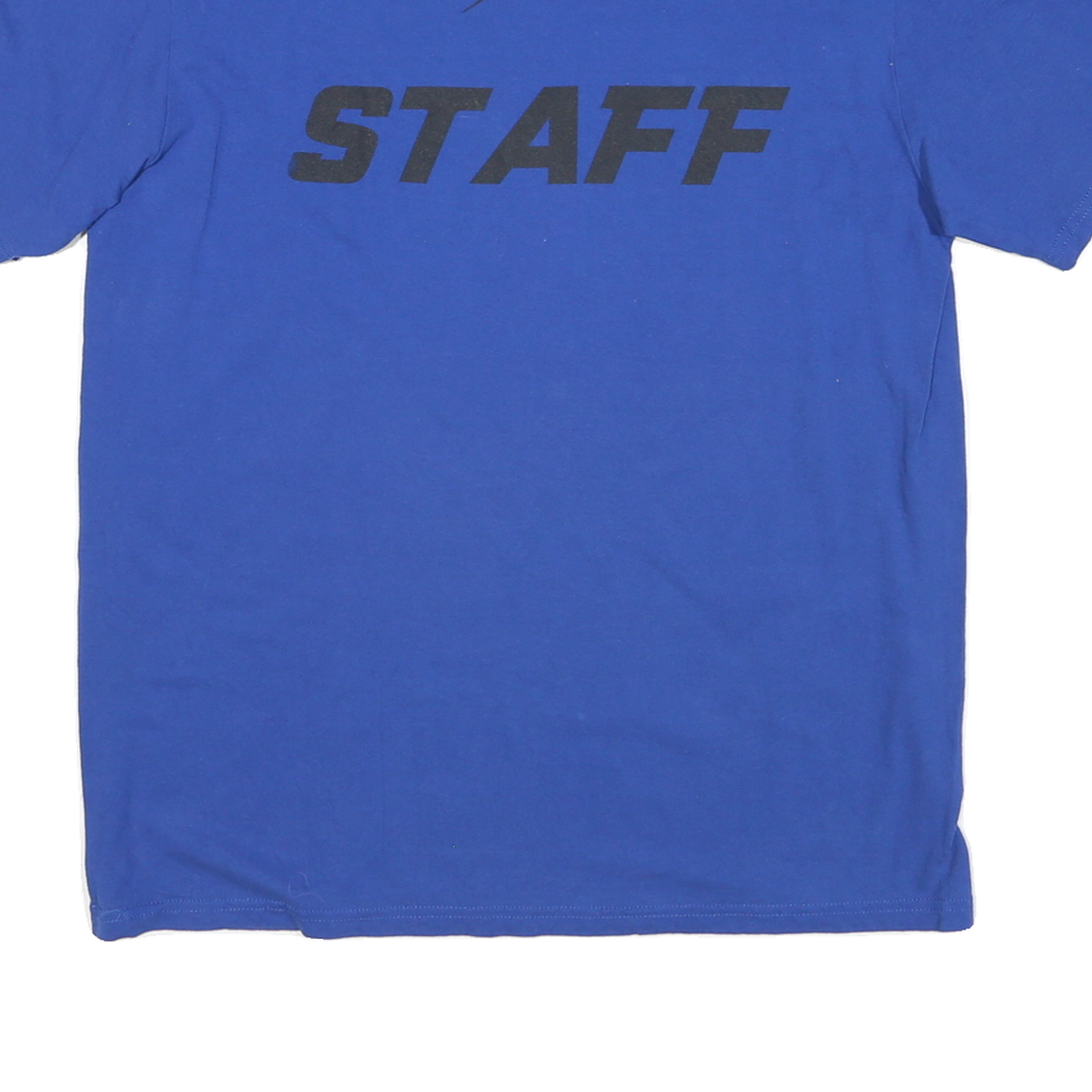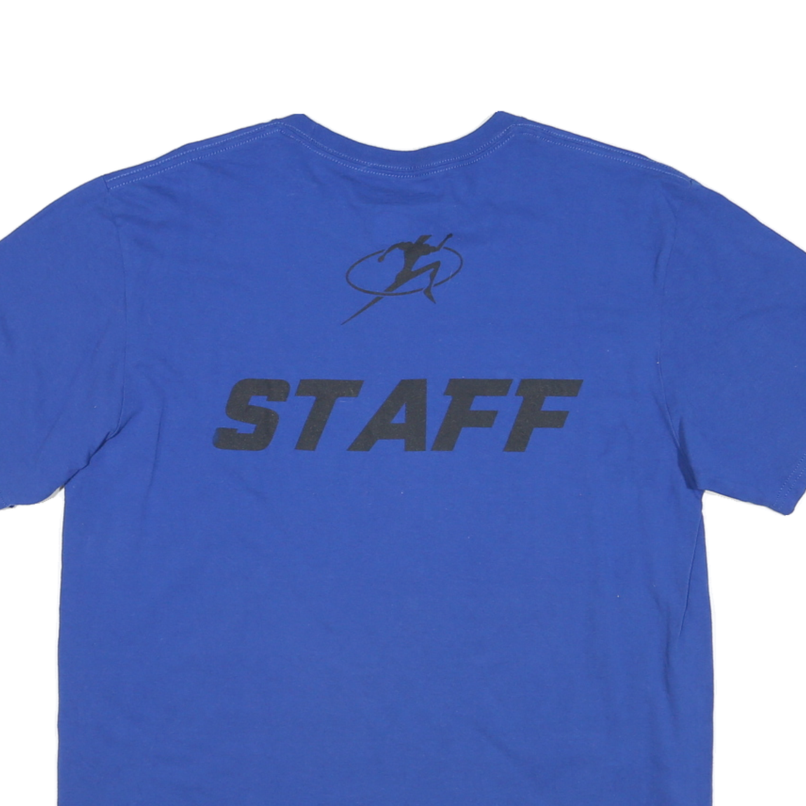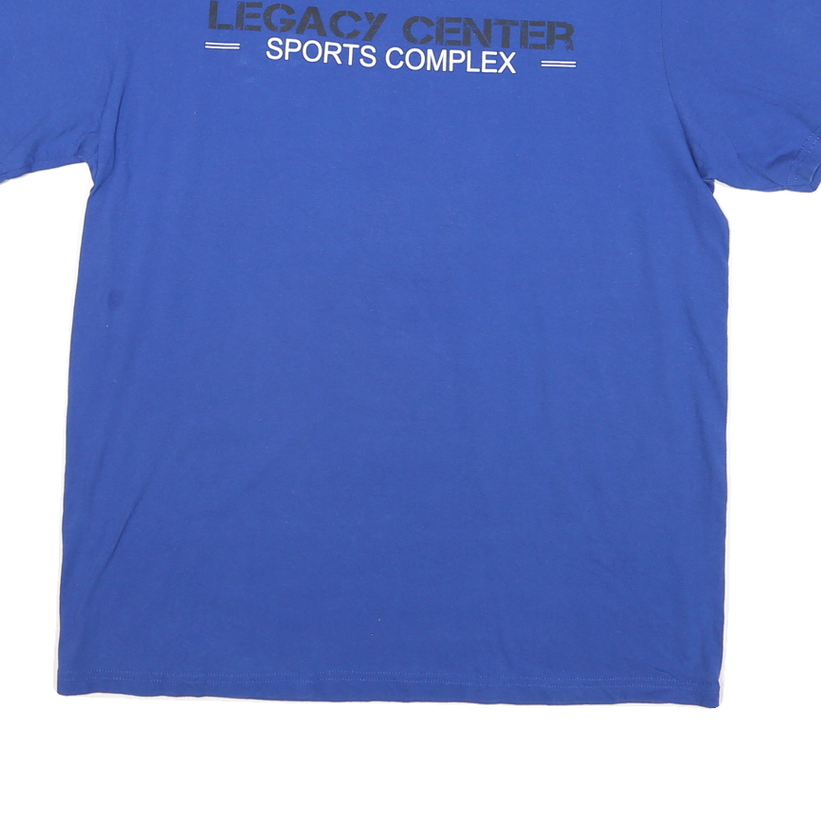 This ADIDAS Mens T-Shirt is crafted in a bold blue colour featuring the text "LEGACY CENTER SPORTS COMPLEX" printed in black and white on the front. The back prominently displays the word "STAFF" beneath a dynamic silhouette graphic. A white ADIDAS logo is neatly printed on the left sleeve, adding authentic branding detail.