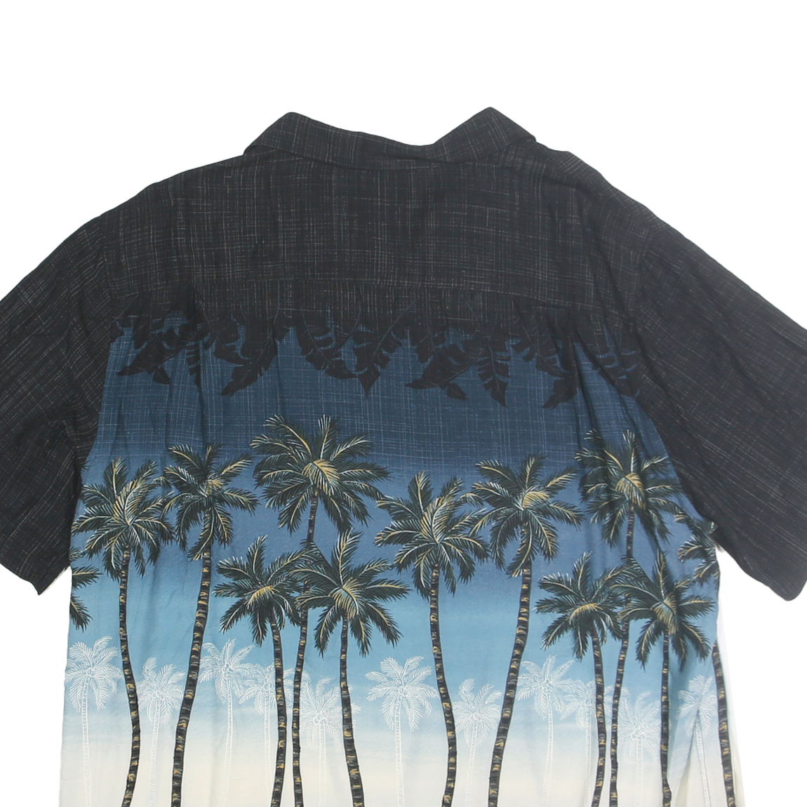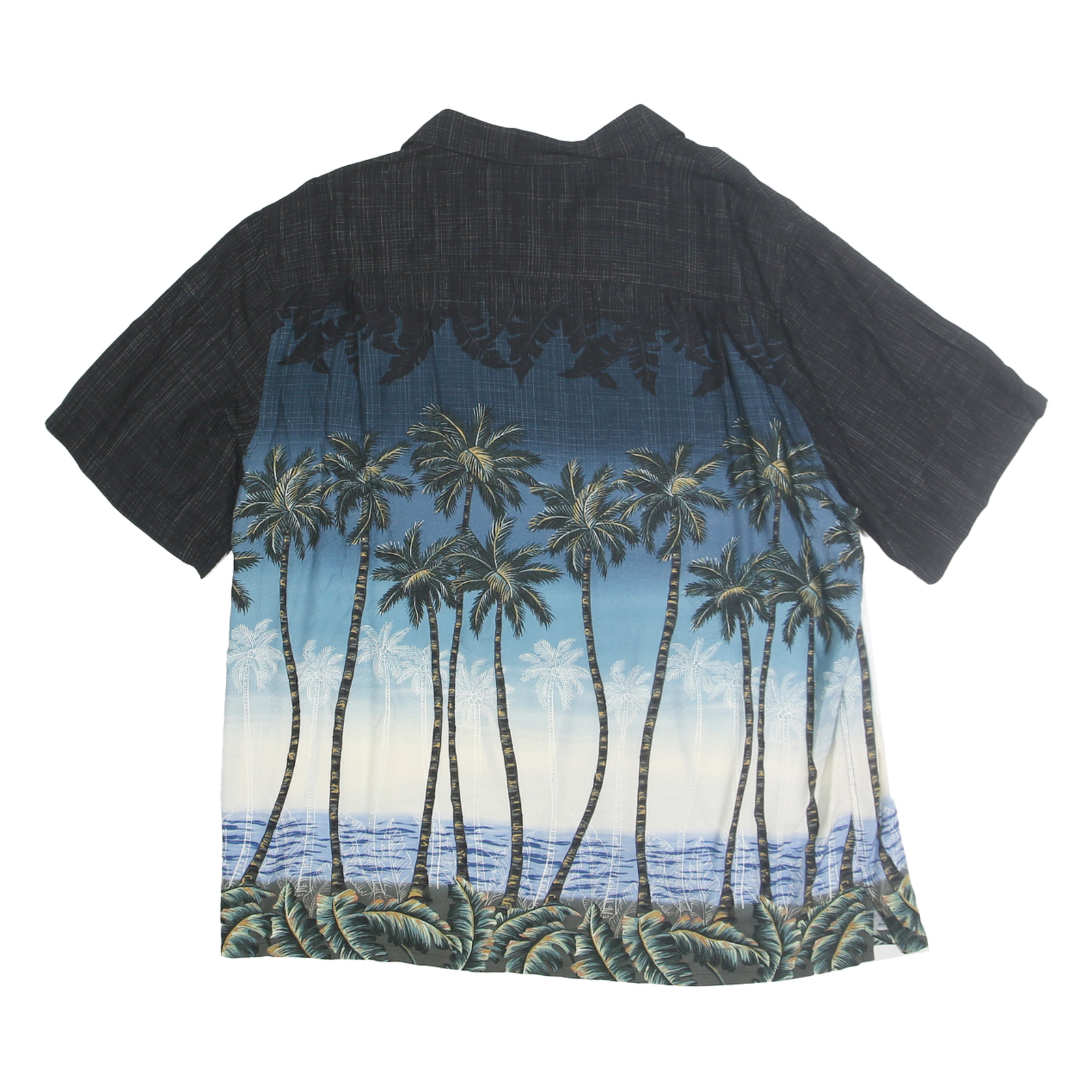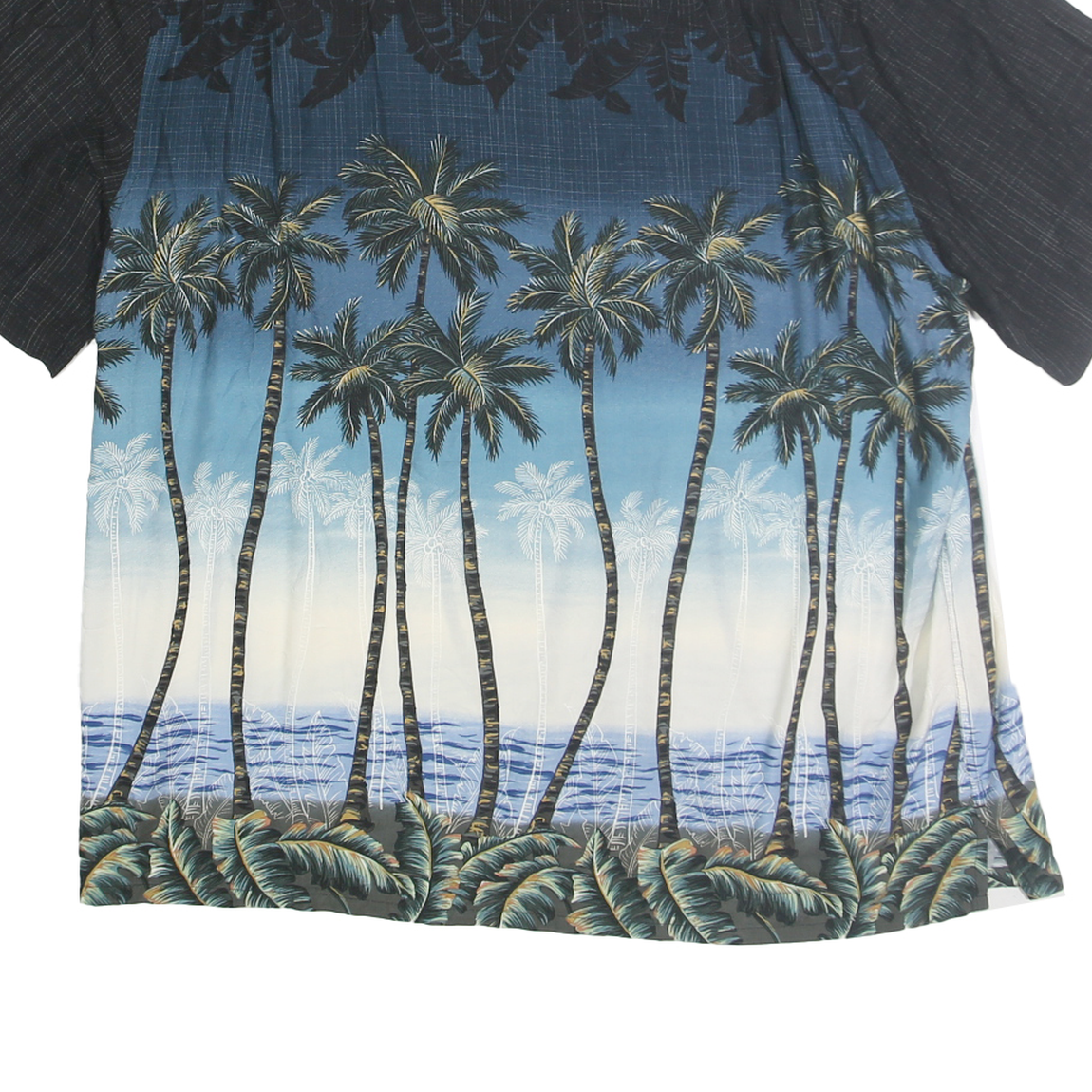 This Batik Bay mens shirt features a striking tropical palm print that transitions from black at the shoulders to a blue ocean scene at the lower body. The shirt's short sleeves and button front complement its relaxed, casual summer style. The upper back and sleeves are solid black with a subtle woven texture, contrasting the vivid coastal graphic on the main body.