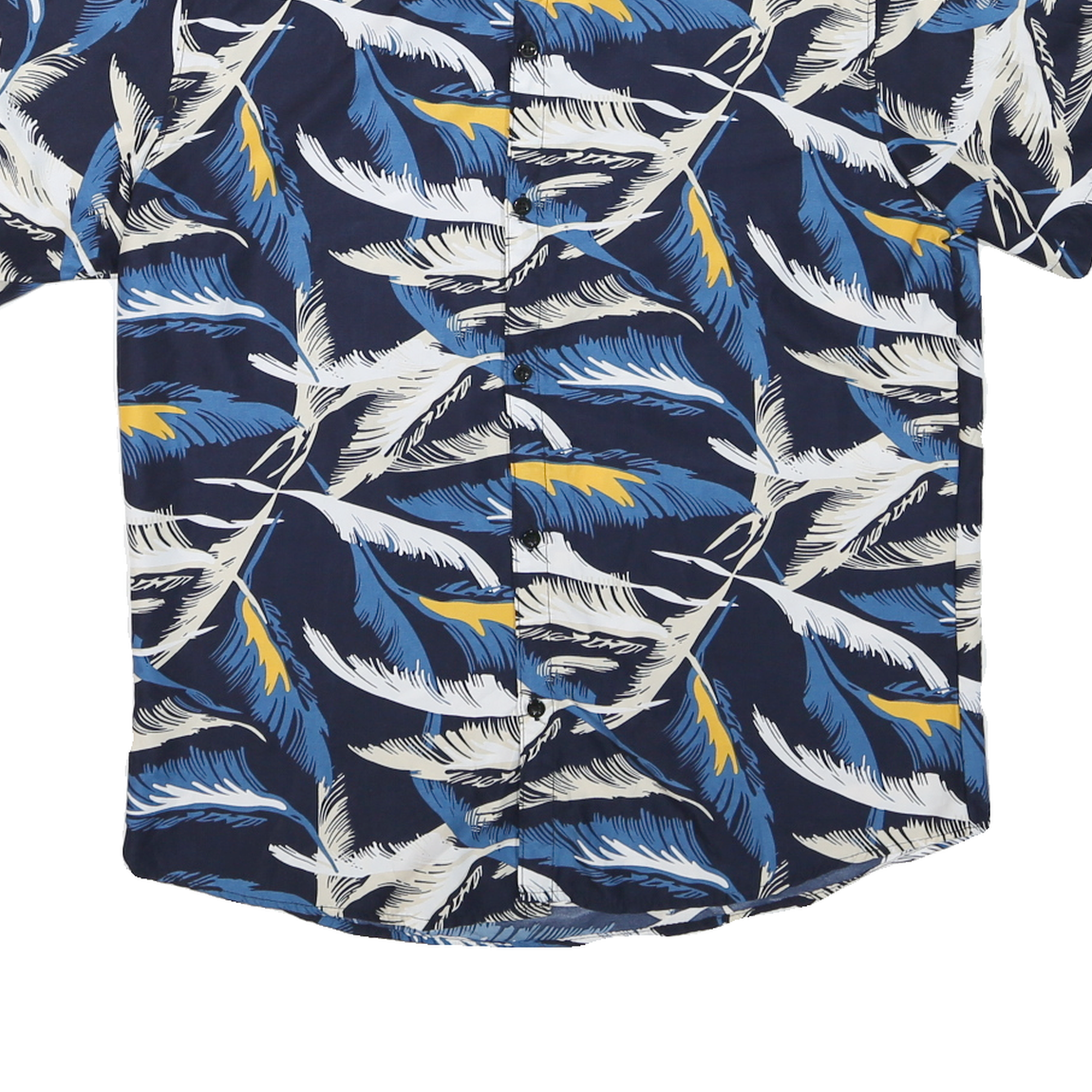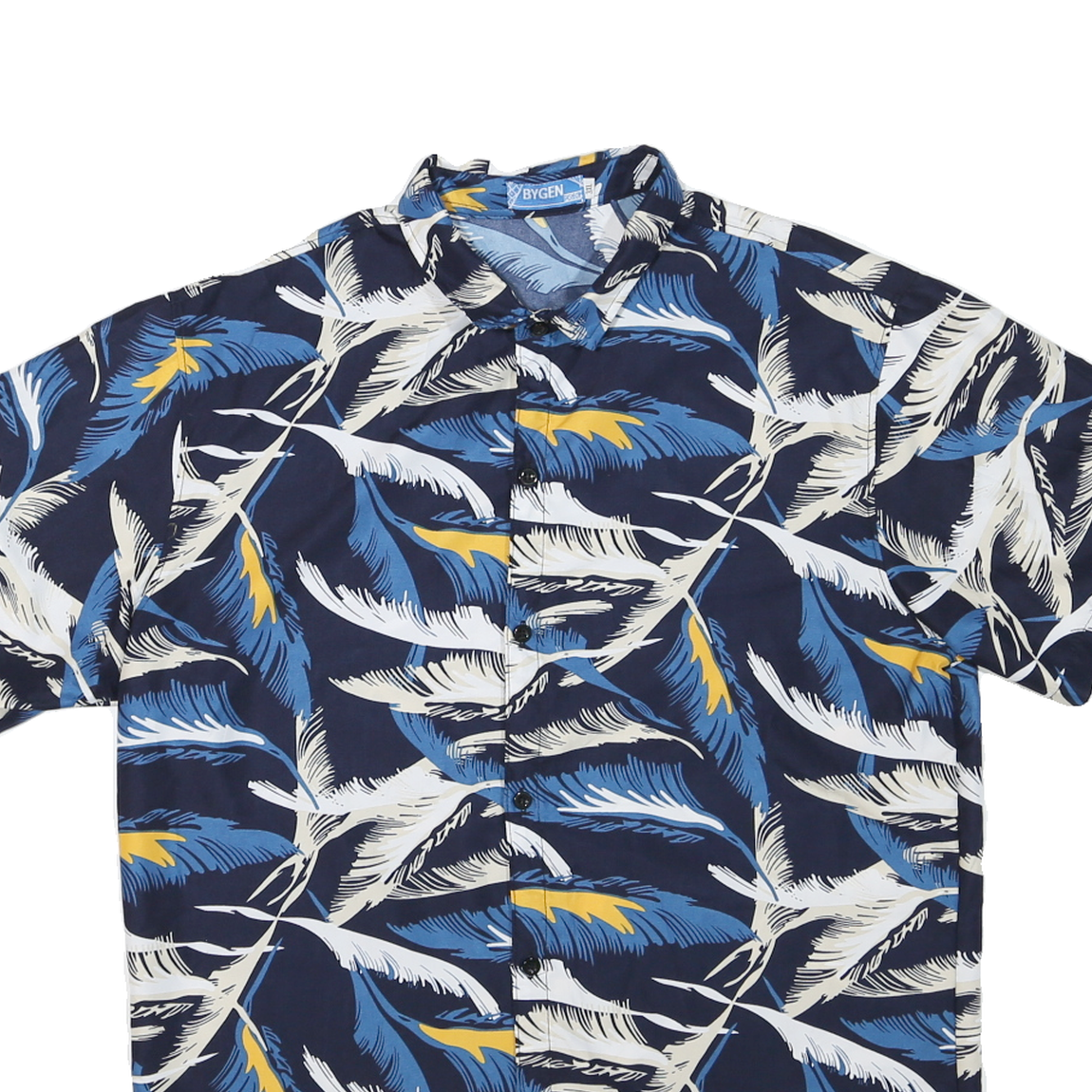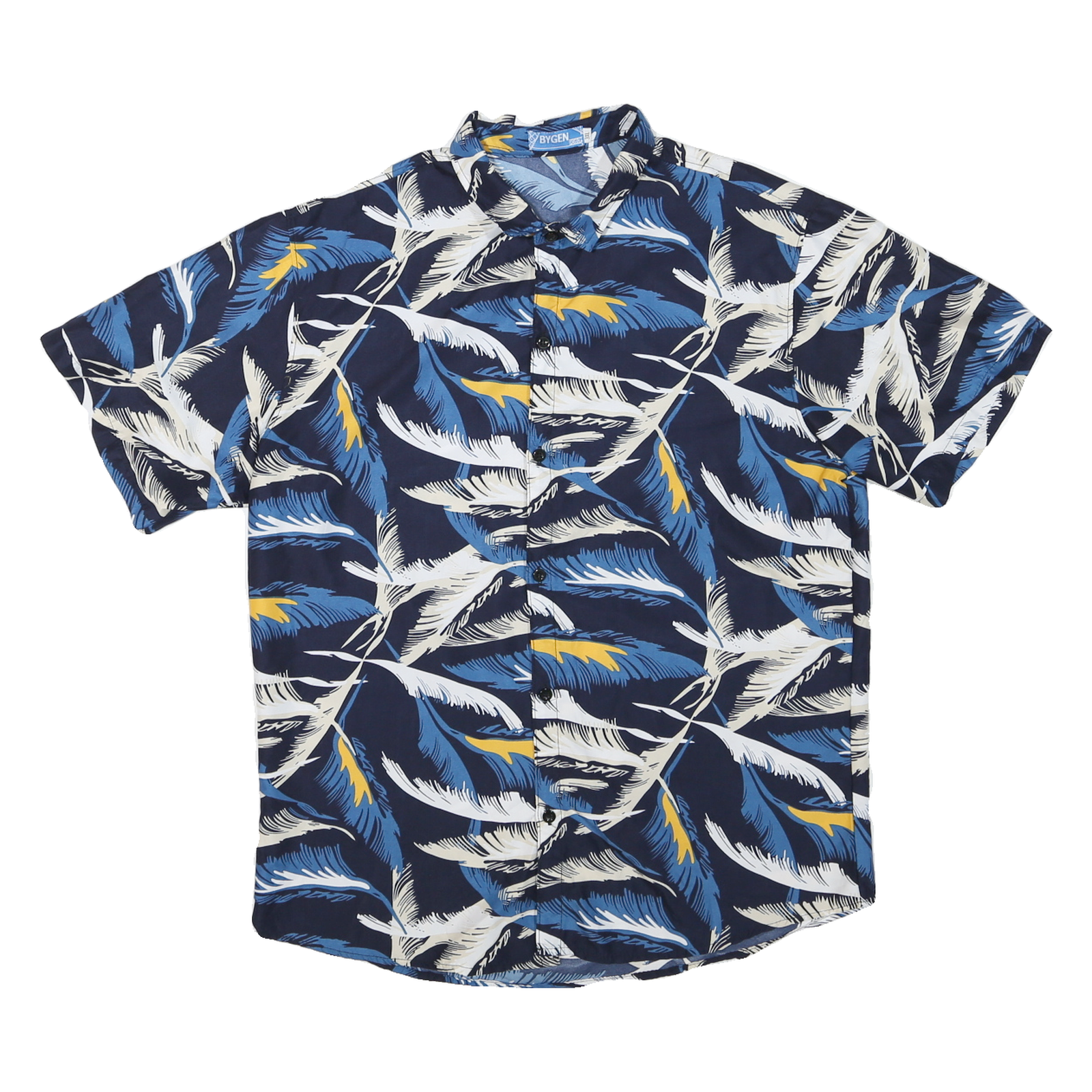 This BYGEN mens shirt features a striking tropical leaf pattern in shades of blue, white, and subtle yellow accents set against a dark navy blue background. The all-over botanical print brings a vibrant and relaxed summer vibe to the design. It has a classic button-down front and a short sleeve cut ideal for warm weather.