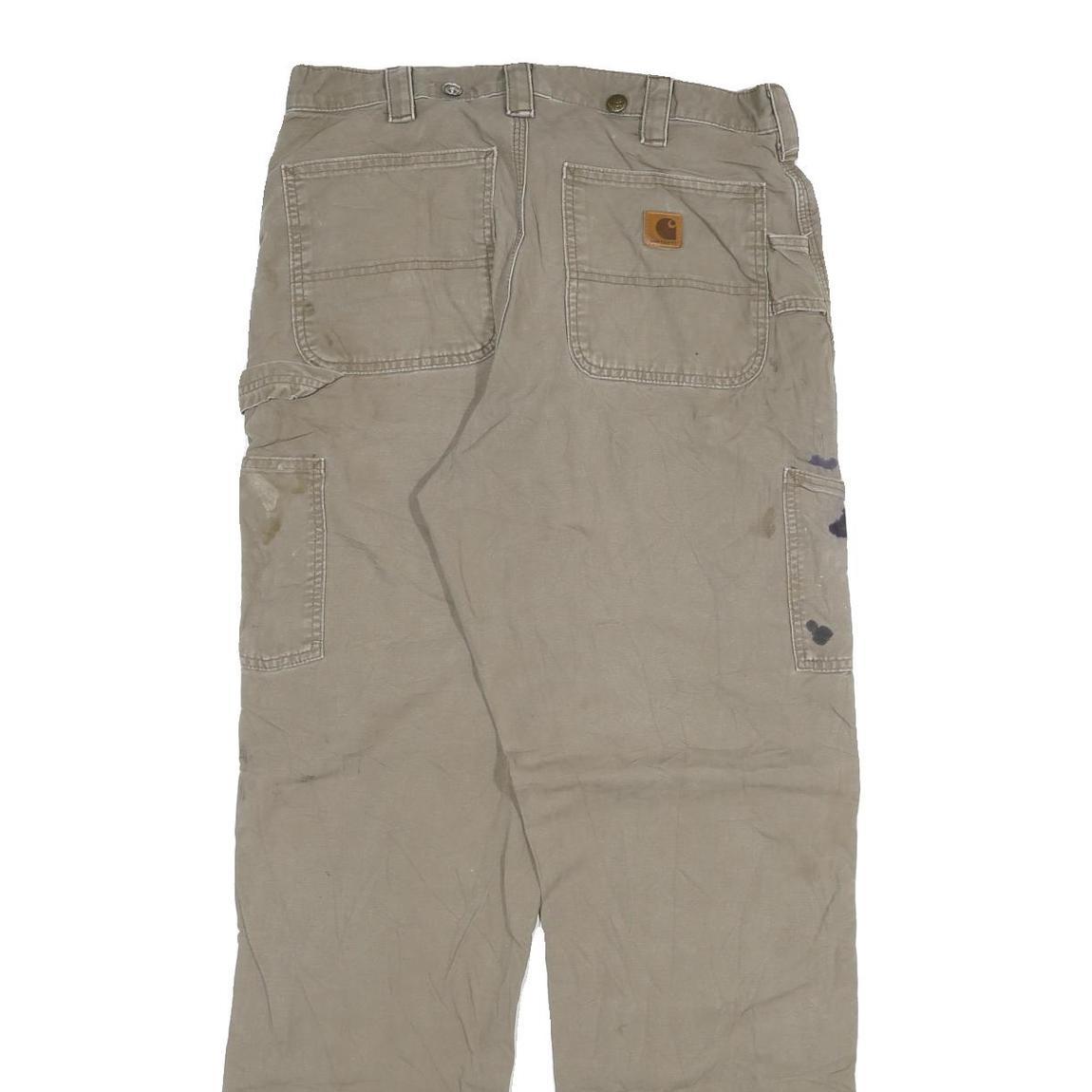 These Carhartt mens jeans come in a versatile beige colour with a relaxed fit and straight leg cut. Made from a cotton blend denim, they offer durability and comfort suitable for workwear or casual use. The jeans feature multiple pockets including patch pockets on the back and a side utility pocket for handy storage, with a visible Carhartt logo patch on the back pocket.
