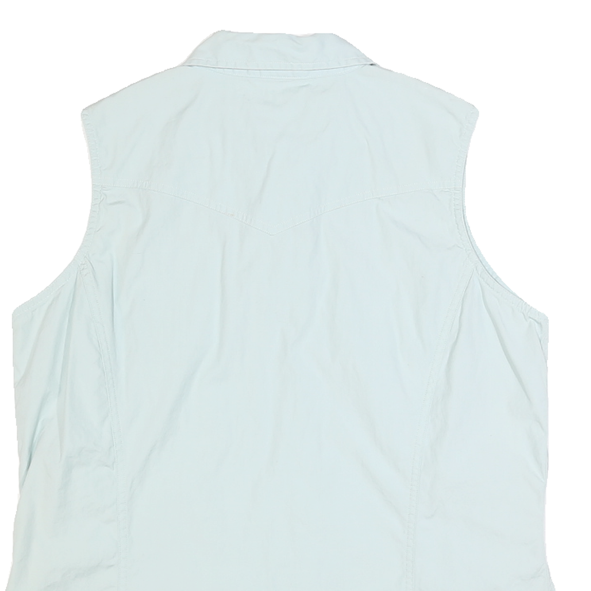 This womens sleeveless shirt by CARHARTT is presented in a soft light blue shade, showcasing a clean and simple design. It features a classic pointed collar and white snap button closures down the front. The shirt has two flap chest pockets with snap fastenings and a subtle CARHARTT label on one pocket giving it authentic brand detailing.