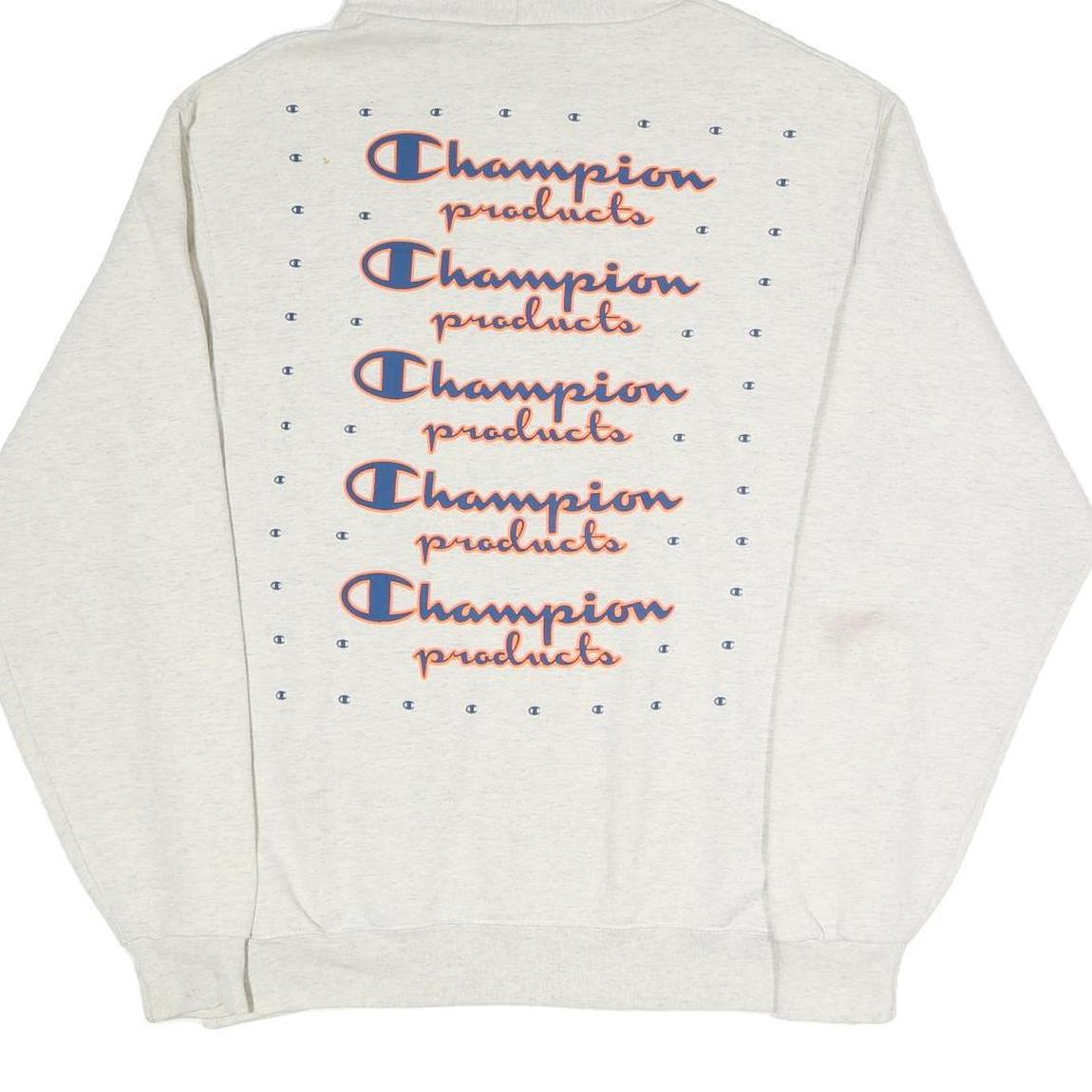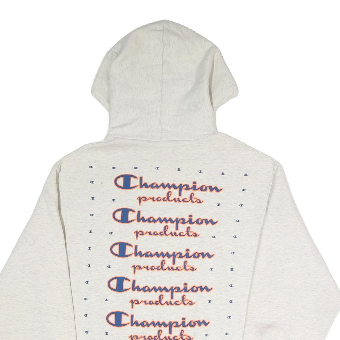 This Champion Mens hoodie is a soft cream colour crafted from a comfortable cotton blend fabric. It features a small embroidered orange Champion 'C' logo on the front left chest and multiple repeating Champion products text graphics in orange and navy across the back.