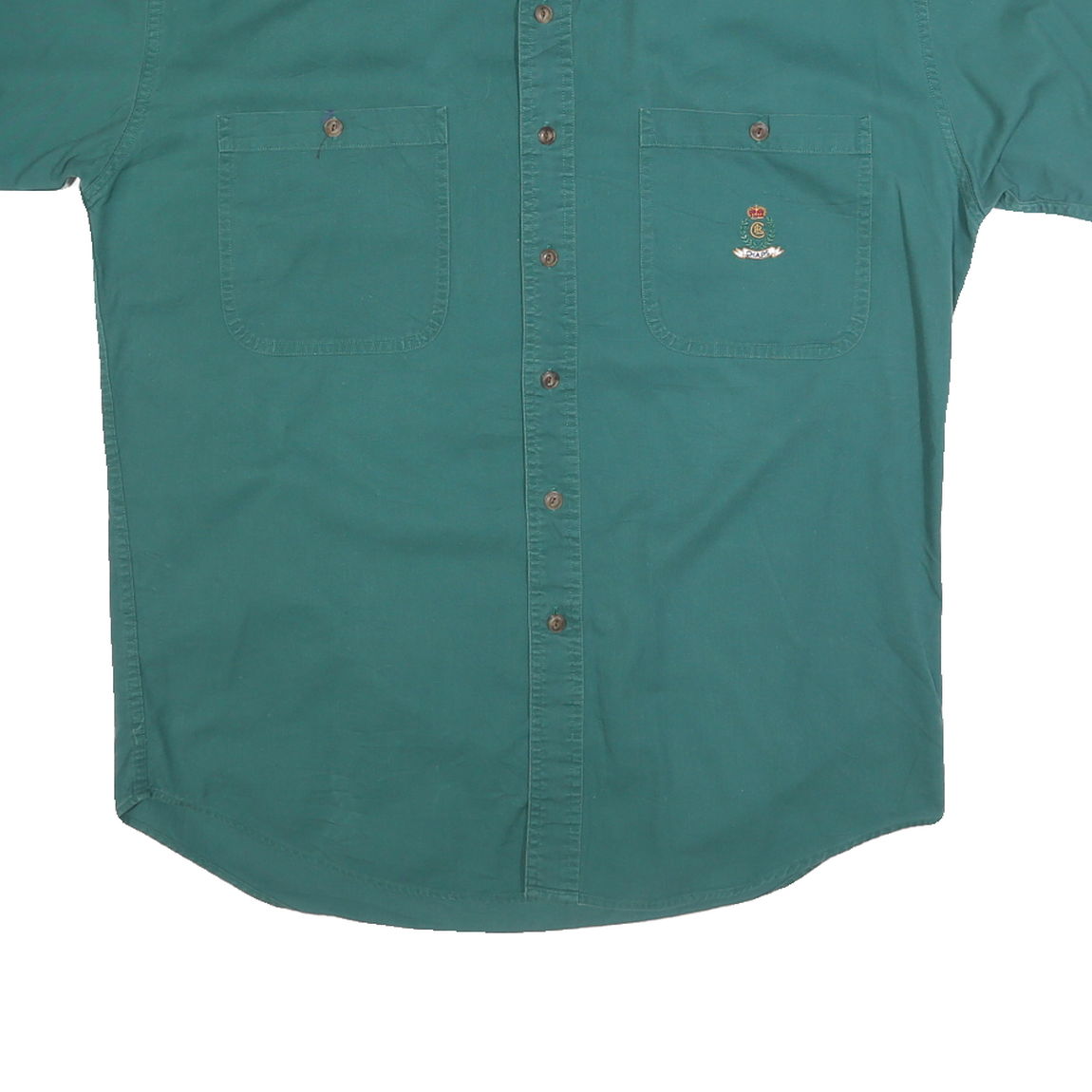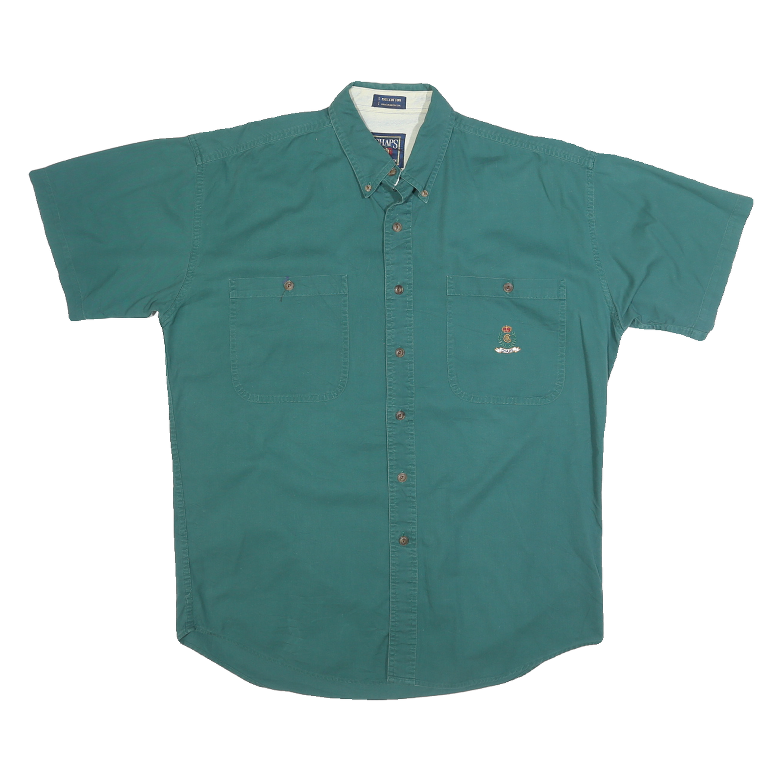 This Chaps mens shirt features a rich green colour with a classic button-down collar and short sleeves. The shirt has two buttoned chest pockets with one pocket displaying the embroidered Chaps logo crest, adding a refined touch to the design. It is crafted from pure cotton fabric, offering a comfortable and breathable wear.