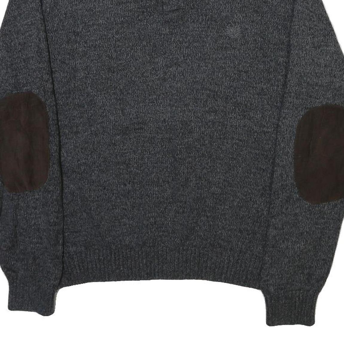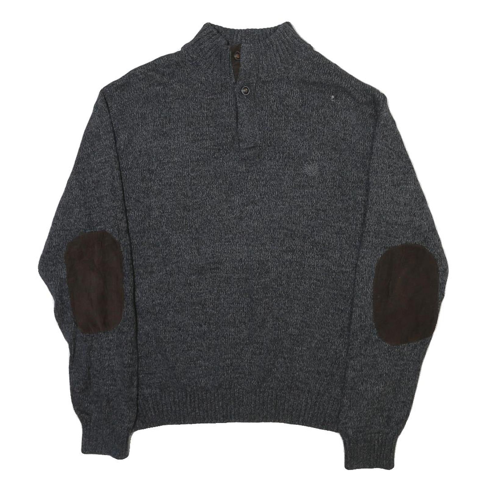 This men's jumper from CHAPS features a classic grey colour with a plain knit pattern for versatile styling. It includes distinctive dark brown elbow patches adding a subtly rugged and vintage feel. The roll neck with a button placket adds extra warmth and style while maintaining a refined look.