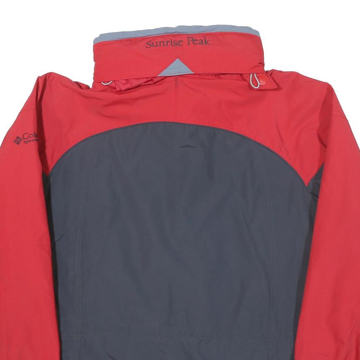 This womens Columbia jacket showcases a bright red primary colour with contrasting grey panels on the sides, back, and sleeves, creating a sporty and dynamic two-tone design. The high collar is embroidered with 'Sunrise Peak' text, while the Columbia Sportswear logo is visible on the left sleeve. It features a full front zip closure concealed by a snap button placket, plus adjustable cuffs with Velcro fastenings and a drawstring hem for a custom fit.