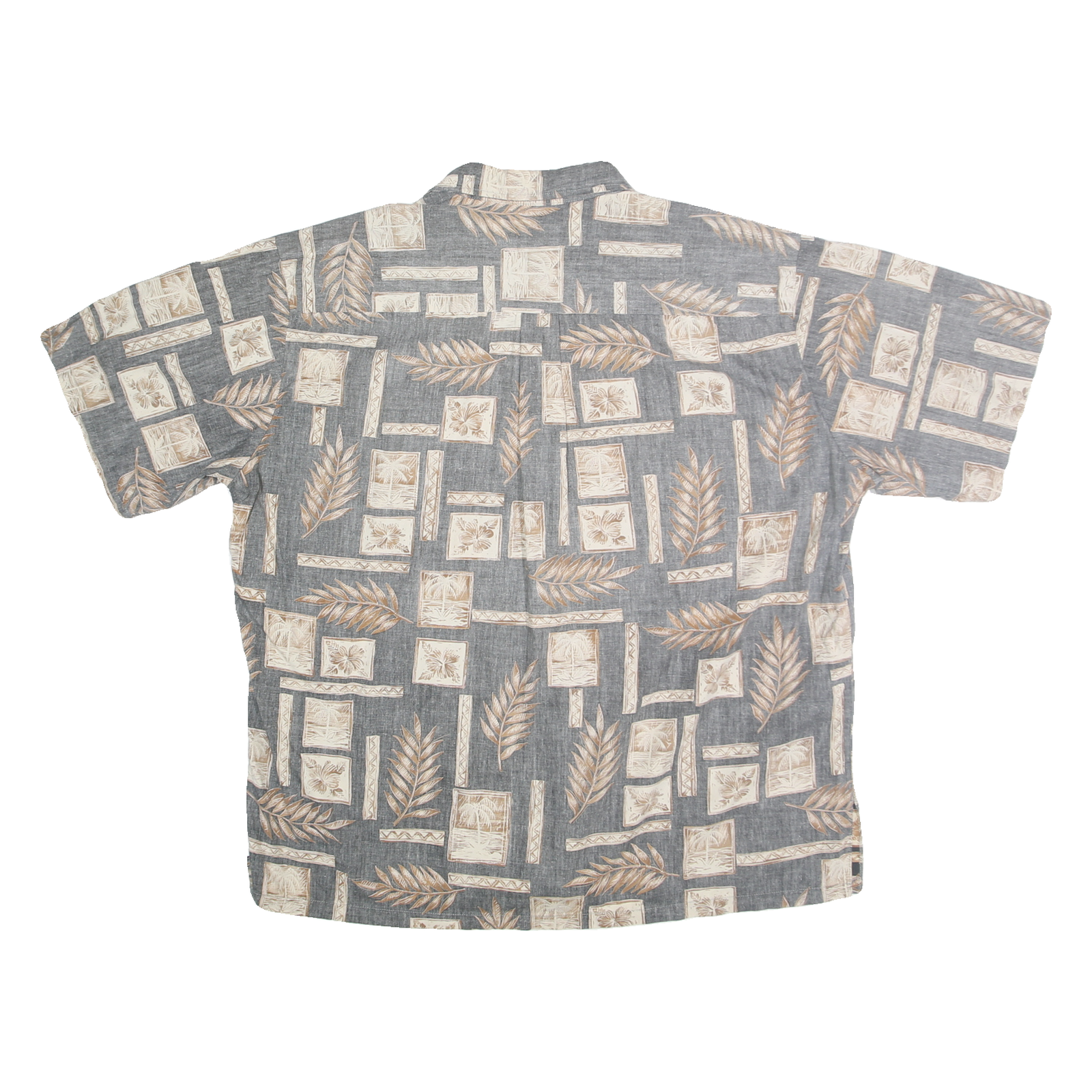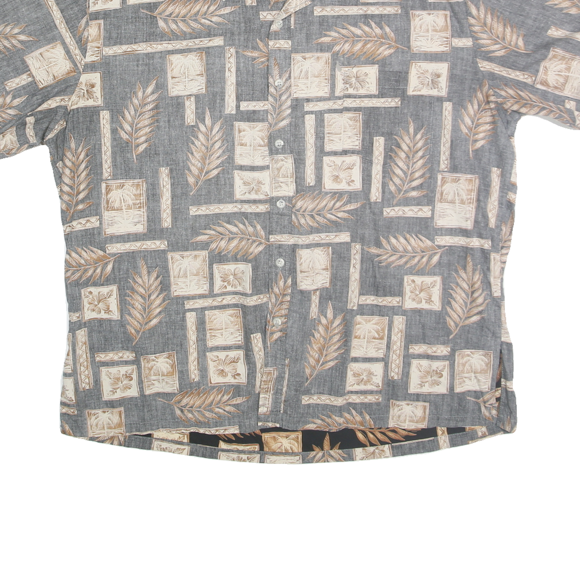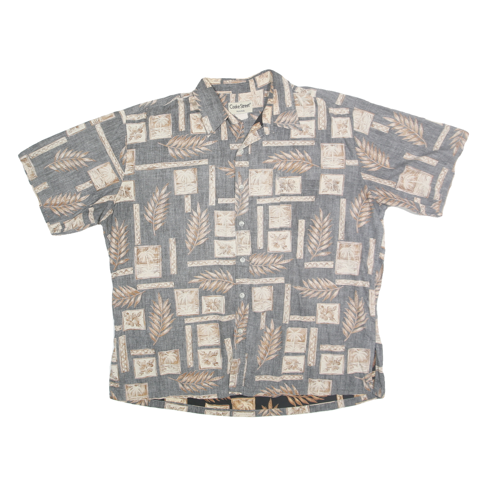 This Cooke Street men's shirt features a stylish Hawaiian print with grey as the primary base colour accented with cream tropical leaf and geometric frame motifs. It has a casual short sleeve design and a button front closure with a classic turn-down collar. The pattern adds an island vibe perfect for warm weather or holiday wear.