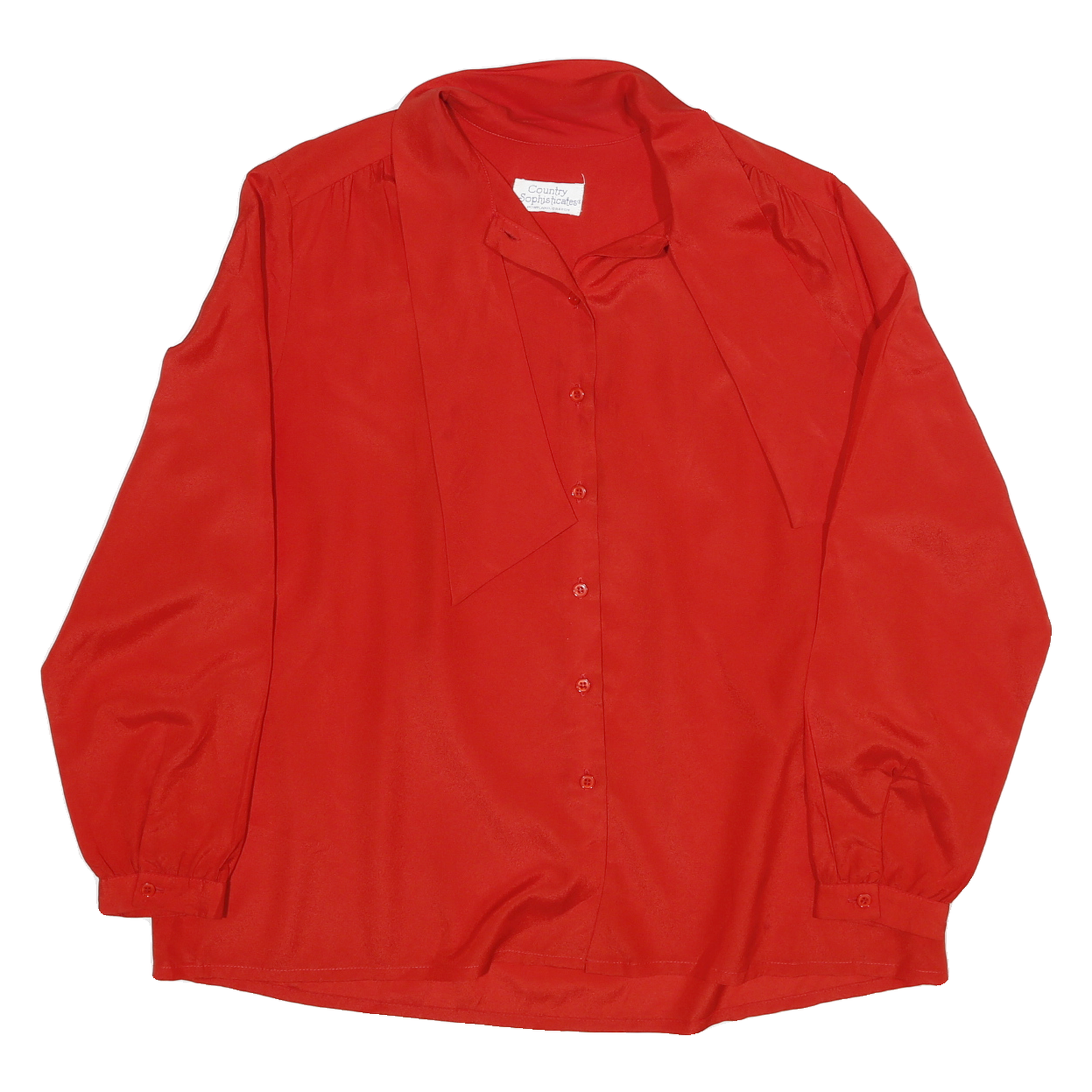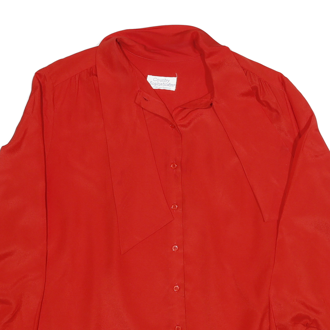 This vibrant red blouse from Country Sophisticates showcases a sleek, elegant design crafted from a soft polyester blend with a slight sheen. The blouse features a distinctive tie neck detail and a button-down front, adding a refined touch to its classic style.