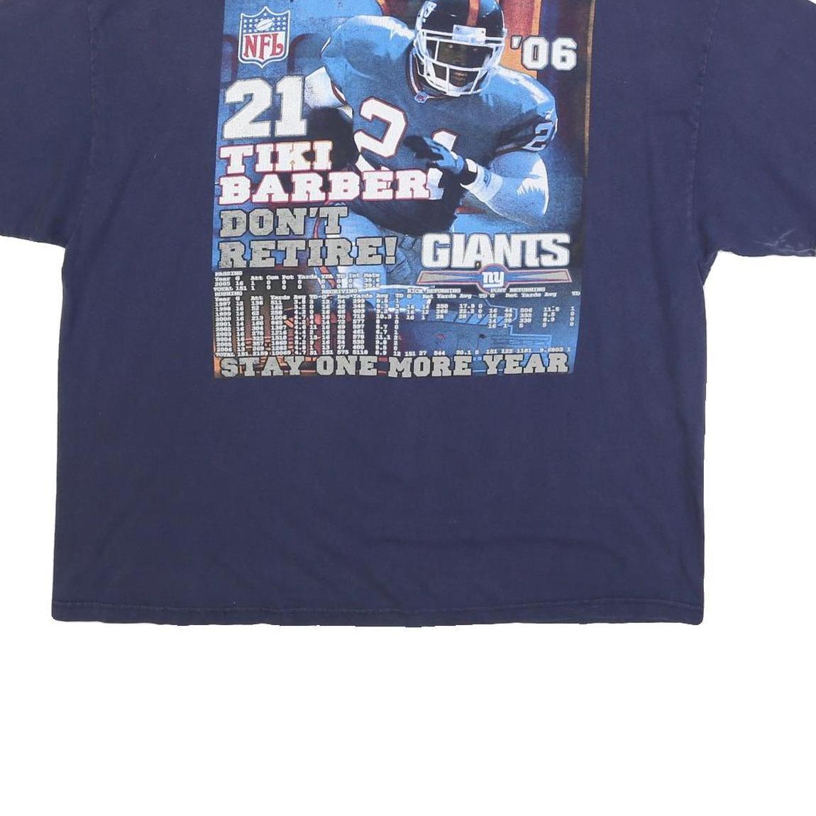 This men's T-shirt from DELTA features a bold navy blue colour with vibrant, large prints on both the front and back. The front displays the text "GIANTS 21 TIKI BARBER NFL '06" alongside dynamic images of Tiki Barber in action wearing his Giants uniform, with a football helmet graphic completing the design. The back print highlights Tiki Barber again with detailed player statistics and an NFL logo, making it a standout piece for fans.
