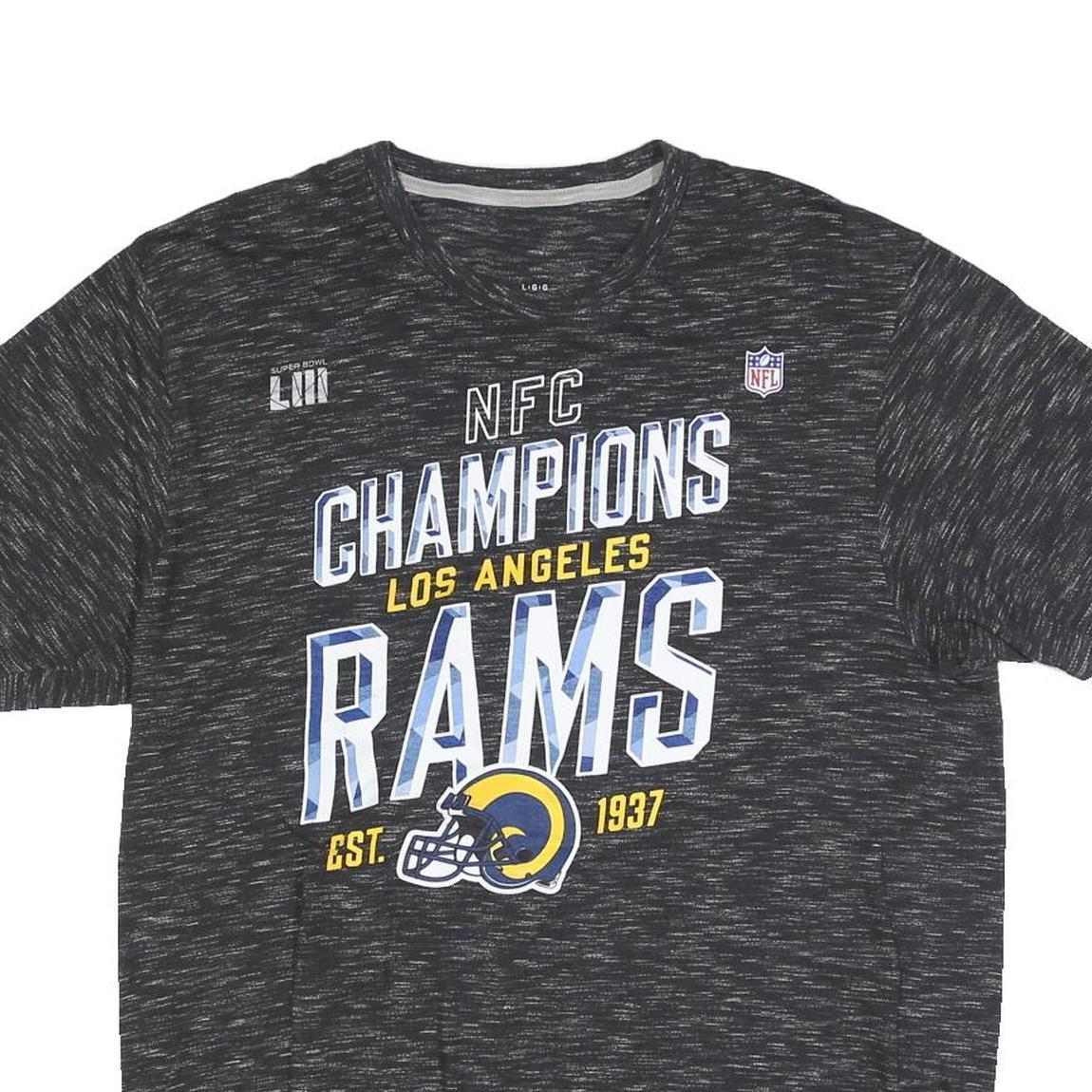 This Fanatics mens t-shirt is styled in a heathered black cotton blend fabric with a soft, comfortable feel. The front features bold graphic text that reads "NFC Champions Los Angeles Rams" alongside the Rams helmet logo in blue, yellow, and white tones, commemorating the 1937 establishment date. Above this are smaller Super Bowl LII and NFL logos, adding official league branding.