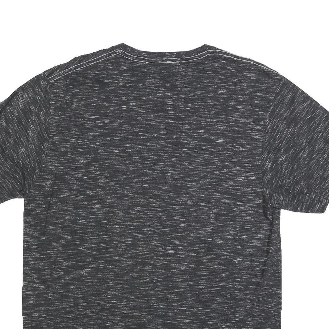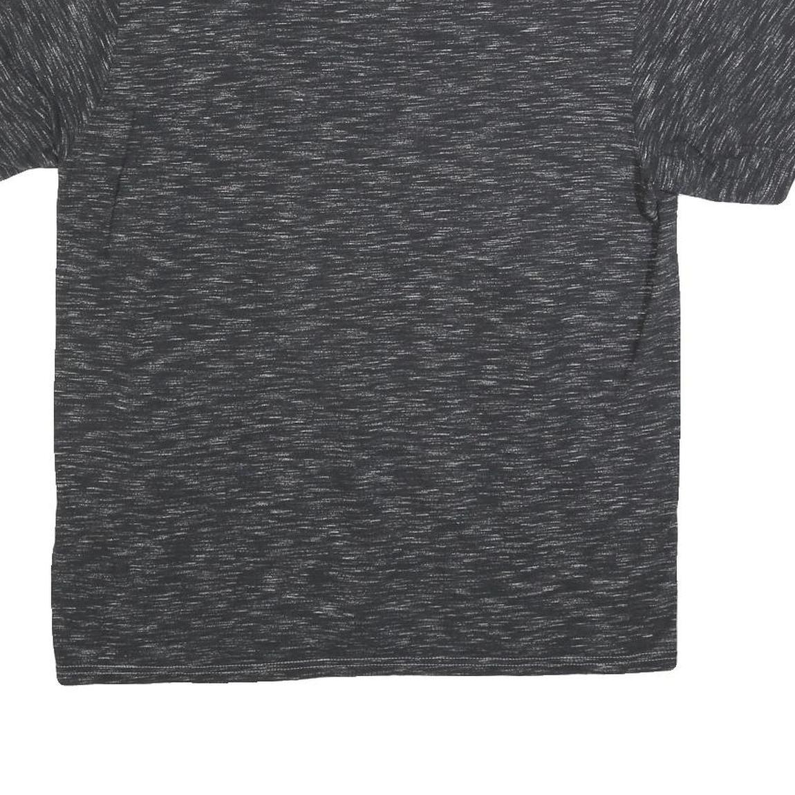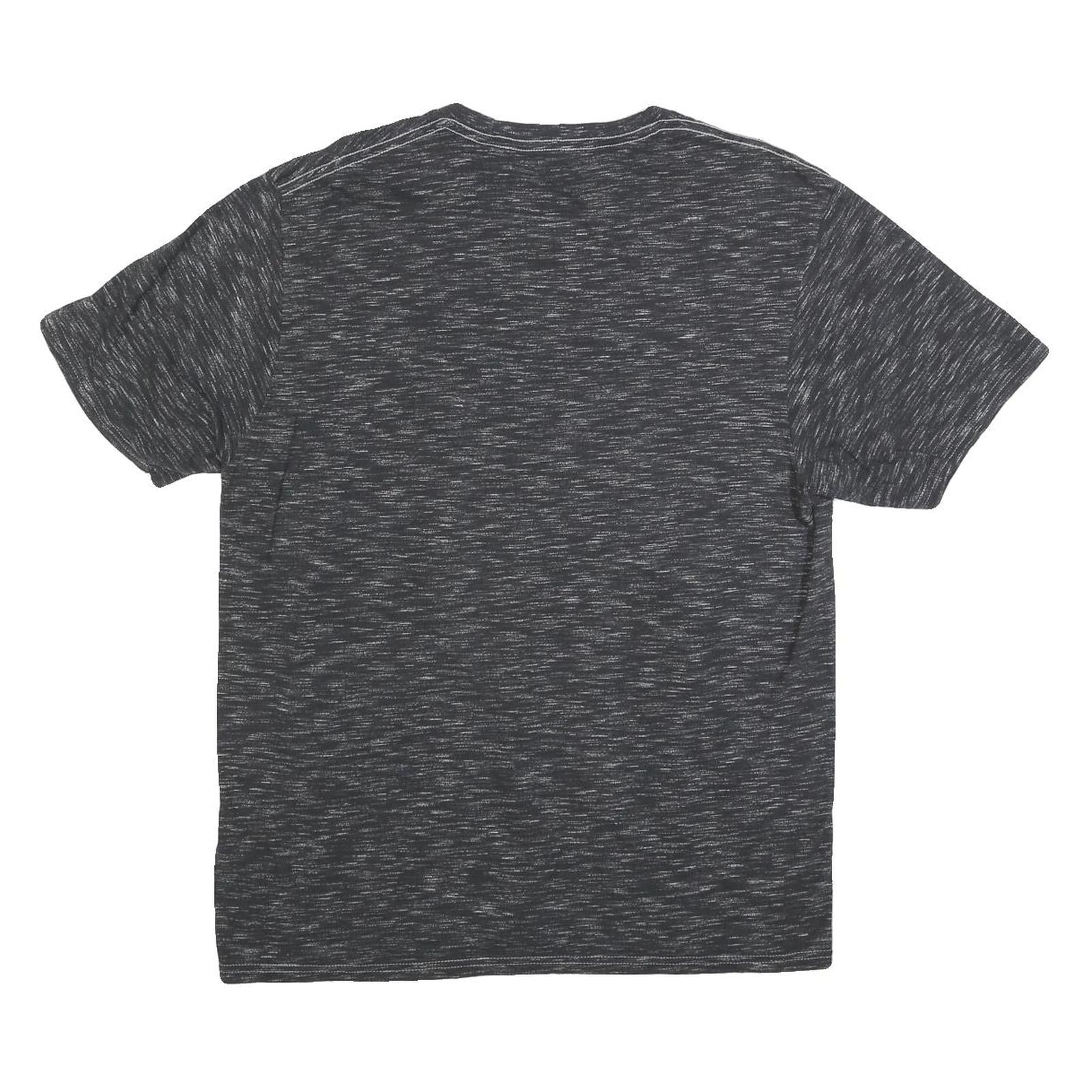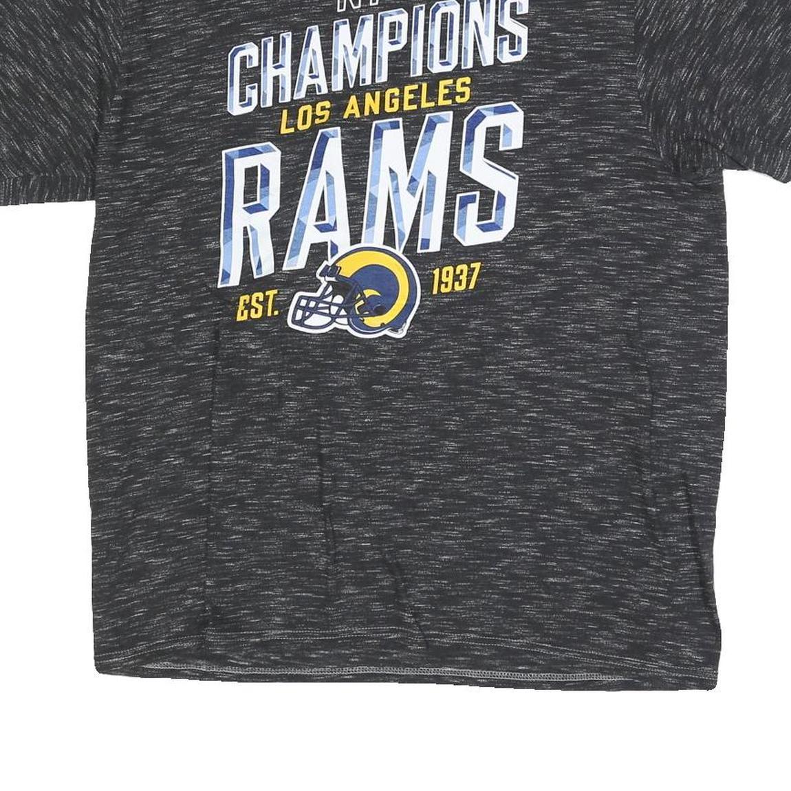 The shirt has a classic crew neck and short sleeves, offering a relaxed and casual fit. It is perfect for fans wanting to show support for the Los Angeles Rams with official NFL licensing. The back is plain heather black with subtle texture from the fabric weave.