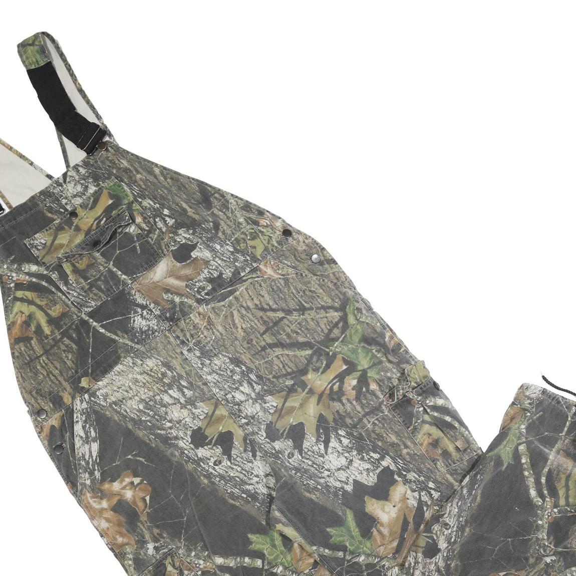These FIELD STAFF mens dungarees feature a natural camouflage print blending shades of green, brown, and grey designed for outdoor and workwear use. The dungarees have adjustable shoulder straps with black detail, multiple functional pockets including a chest pocket, and secure button closures. Drawstrings at the ankle hems allow for a customised fit.