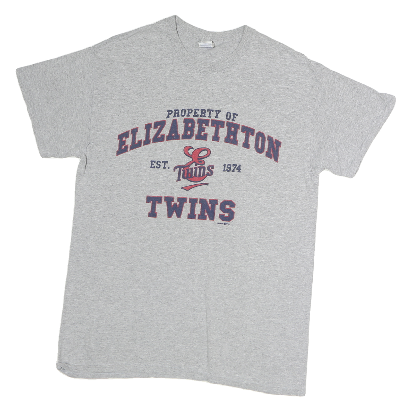 This mens T-shirt from GILDAN features a light grey base with a bold graphic print in dark red and navy blue on the front. The design reads "Property Of Elizabethton Twins Est. 1974" with a stylised Twins logo in the centre, creating a sporty, collegiate look. The back of the shirt is plain grey, offering a clean, classic style.