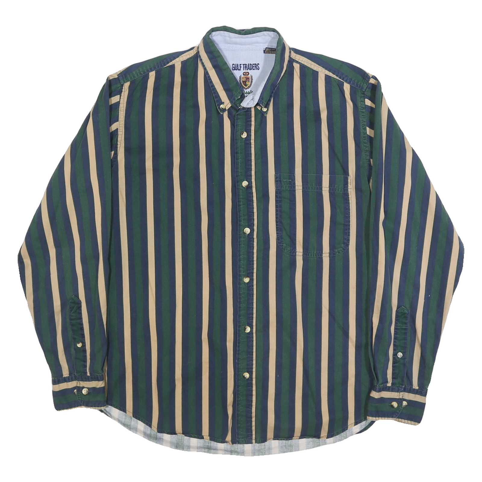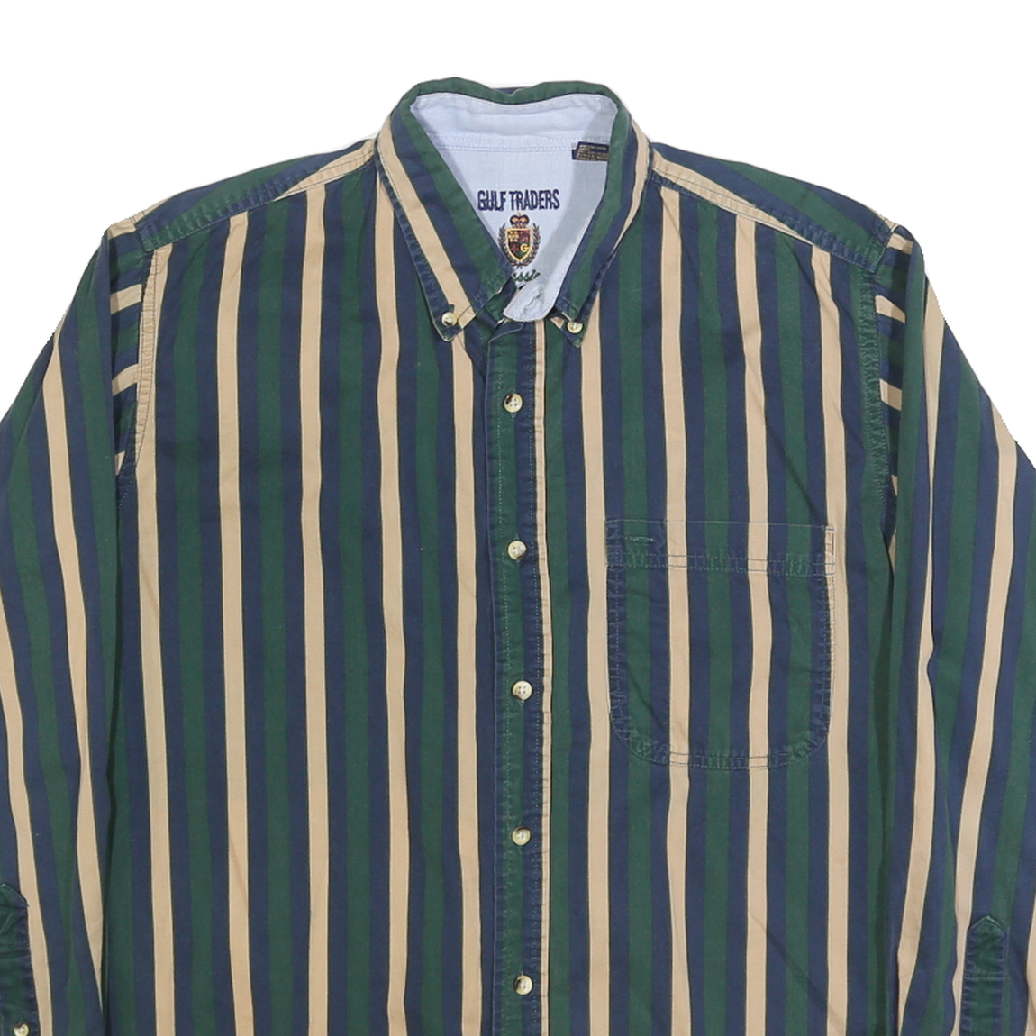 This men's shirt from GULF TRADERS features bold vertical stripes in blue, green, and beige, creating a classic yet striking pattern. The button-down collar and front button fastening add traditional style elements, while a single chest pocket brings useful detail to the design.