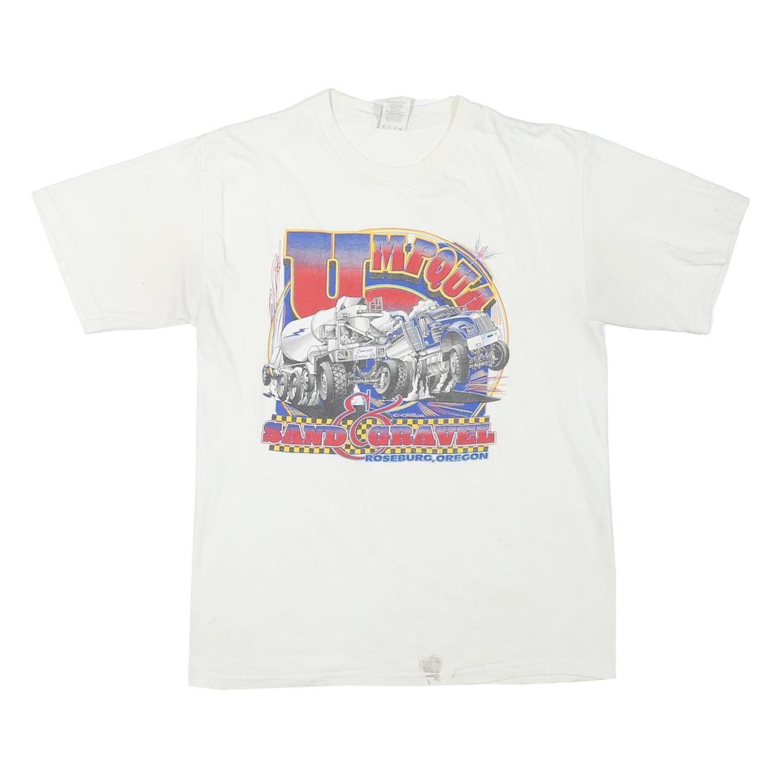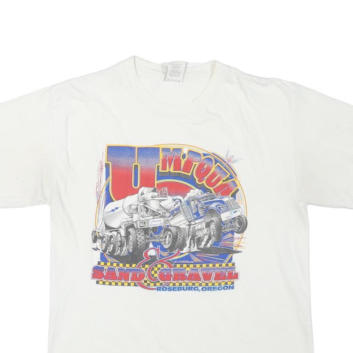 This Hanes Mens T-Shirt is crafted from a soft cotton blend fabric, offering comfort and breathability. It features a white base colour with a large detailed graphic print on the front showcasing construction vehicles and the text "Sand & Gravel Roseburg, Oregon." The shirt has short sleeves and a classic crew neck design, making it a casual and versatile piece for everyday wear.