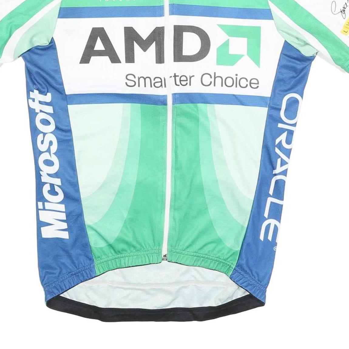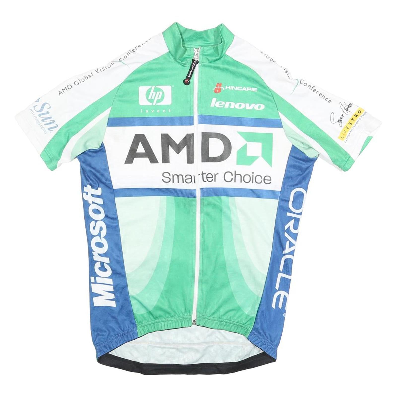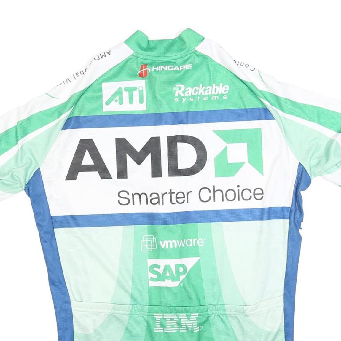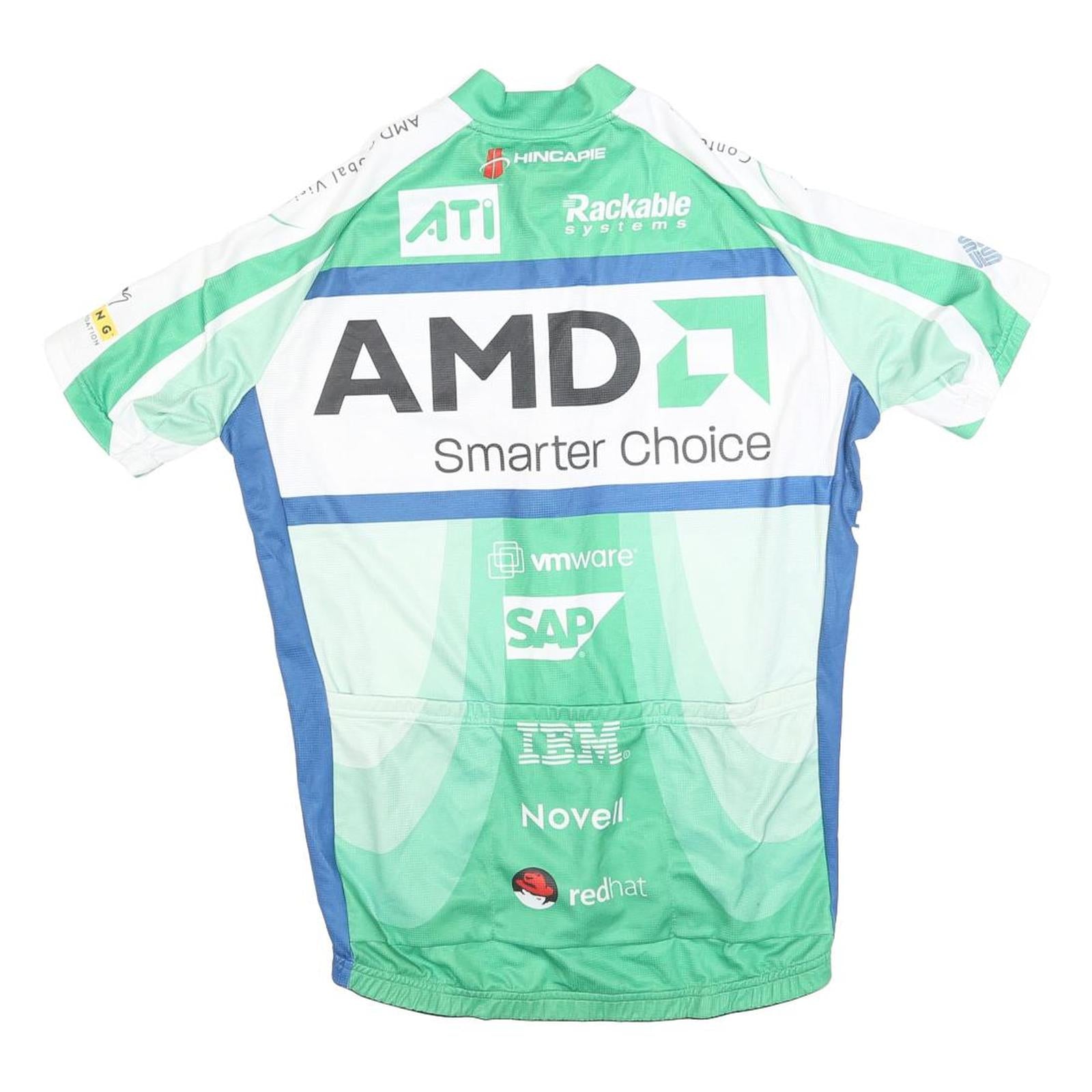 This Hincapie men's cycling jersey features a vibrant green base with striking blue side panels and white accents. It prominently displays sponsor logos including AMD, Microsoft, Lenovo, HP, ATI, VMware, SAP, IBM, Novell, and Redhat, primarily in white and black print. The front and back both showcase the AMD 'Smarter Choice' slogan, making this a distinctive piece for cycling enthusiasts and collectors.
