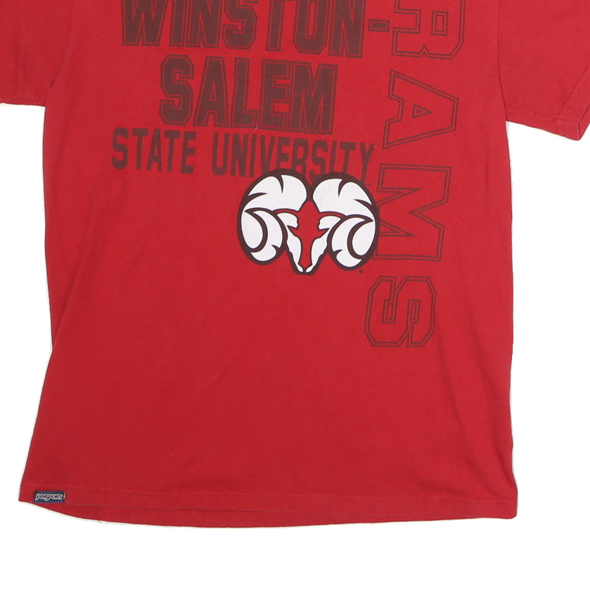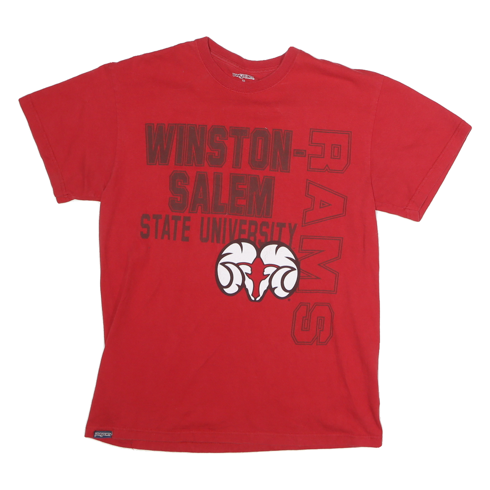 This JANSPORT Mens T-shirt is crafted from soft, comfortable cotton that feels breathable and light against the skin. It features a vibrant red colour as the base, with bold black and white graphic text on the front reading "Winston Salem State University" alongside a distinct ram head emblem, giving the shirt a collegiate and sporty style.