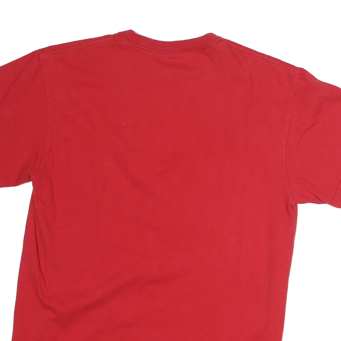 The shirt fits as a regular medium size with a classic crew neckline and short sleeves, designed for a straightforward, versatile silhouette. The back is plain red with no extra graphics or branding, making it an easy piece for casual wear or university-themed outfits. The JANSPORT branding tag is visible at the bottom hem, signifying quality and authenticity.