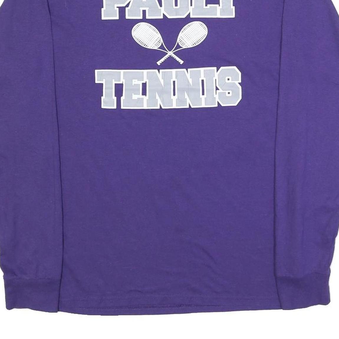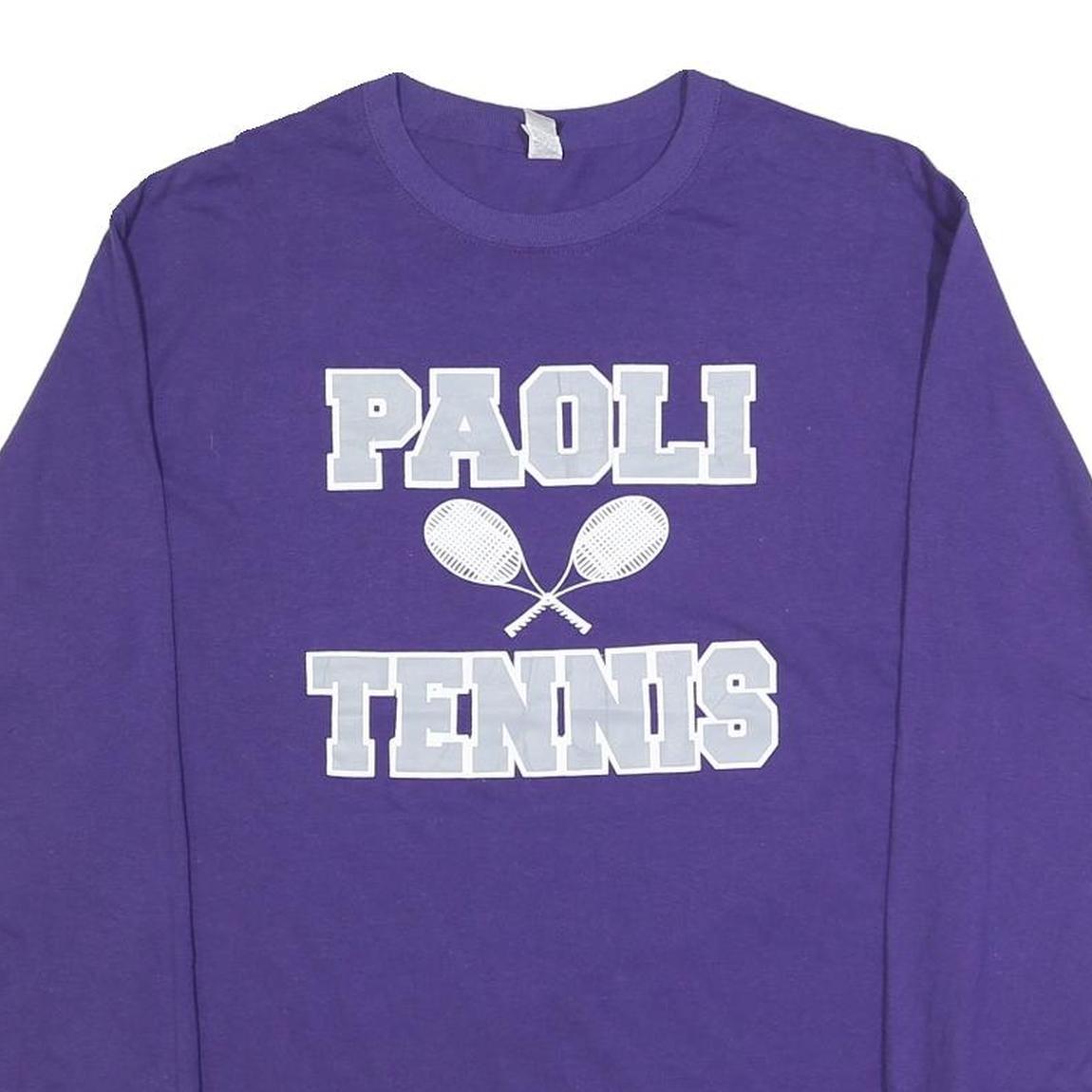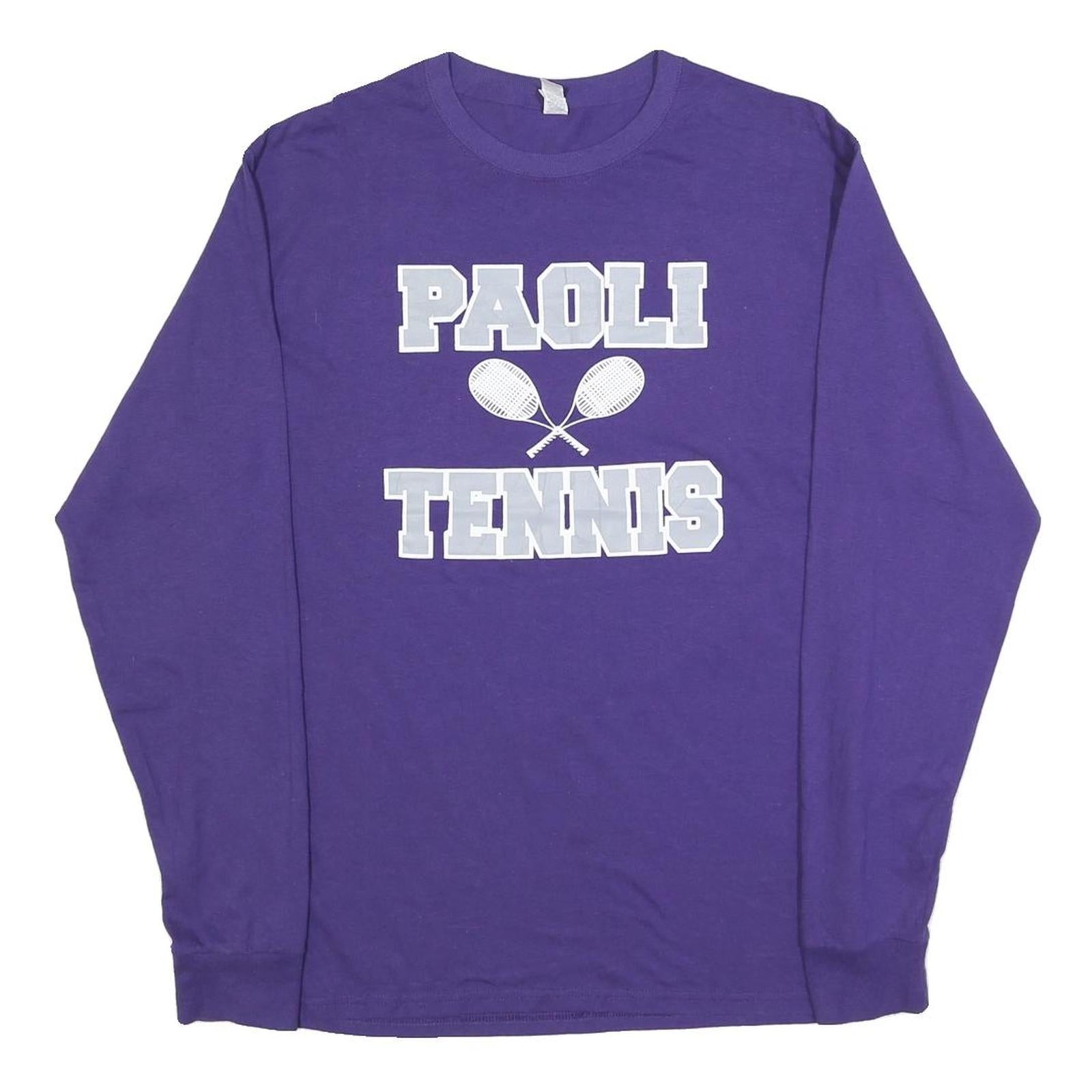 This Jerzees Mens long sleeve T-shirt features a bright purple base colour with bold light grey text and graphic on the front reading 'PAOLI TENNIS' accompanied by two crossed tennis rackets. The text is printed in a collegiate block style, making it a standout piece for casual wear or sports-themed outfits.