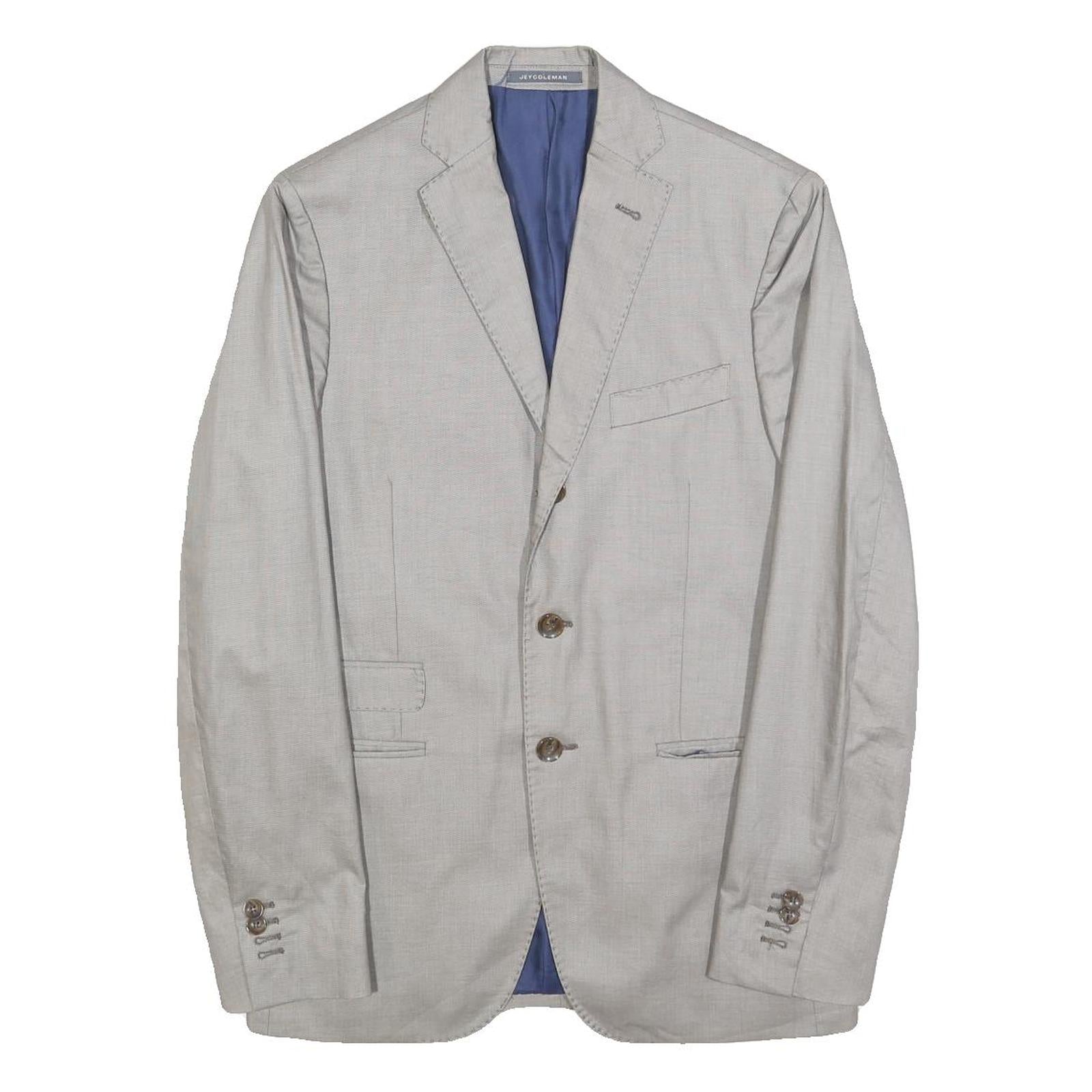 This Jey Coleman mens jacket features a sophisticated light grey colour with subtle fine woven detail, perfect for formal and smart casual occasions. It has a classic single-breasted design with two front buttons and three functional cuff buttons, offering a tailored fit and timeless look.