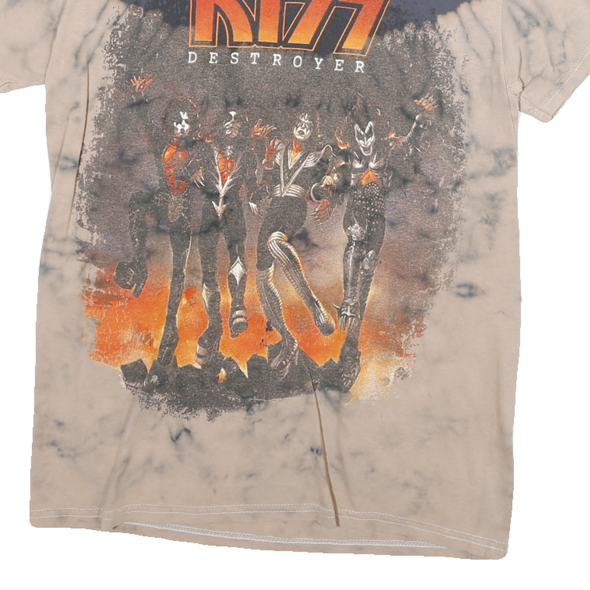This KISS Mens T-shirt features a distinctive beige and grey tie-dye effect with a striking front graphic of the iconic band members and the "KISS Destroyer" logo in bold orange and black. The imagery has a vintage rock vibe, reflecting the band's classic and legendary style.