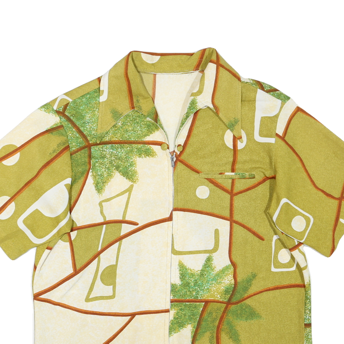 This mens shirt features a distinctive abstract pattern in shades of green and cream with brown line detailing creating a unique artistic design. The shirt has short sleeves and a pointed collar, complemented by a central zip closure and a slender chest pocket for small items. The visual style is bold and retro, suitable for casual wear and summer outings.