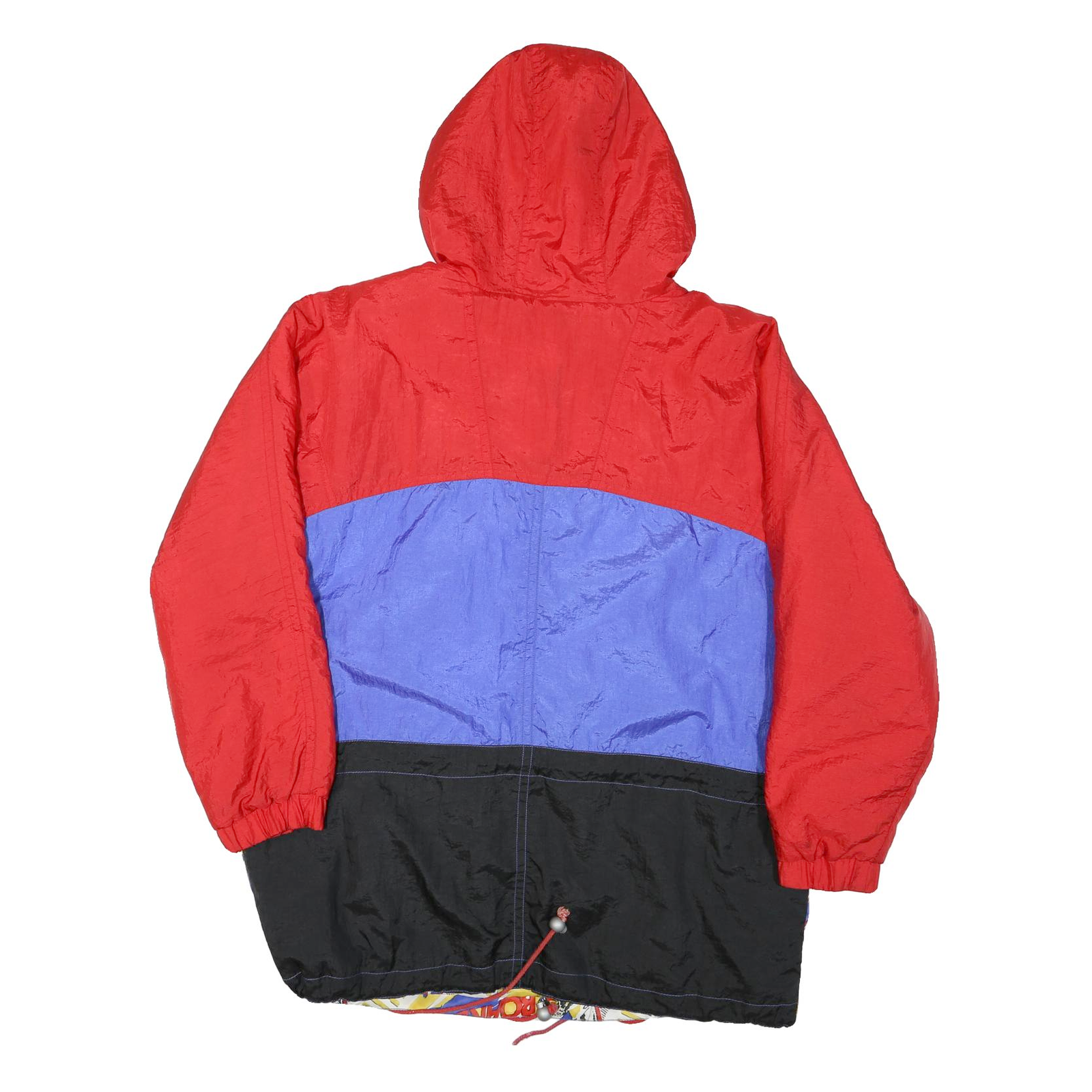Made from a polyester blend, this jacket has a lightweight and slightly crinkled texture, ideal for casual wear and light outdoor activities. The fit is relaxed with elastic cuffs and a drawstring hem securing warmth and comfort. The hood is equipped with drawstring toggles allowing for a snug fit in windy conditions. This distinct jacket combines striking visual appeal with practical design features for everyday use.