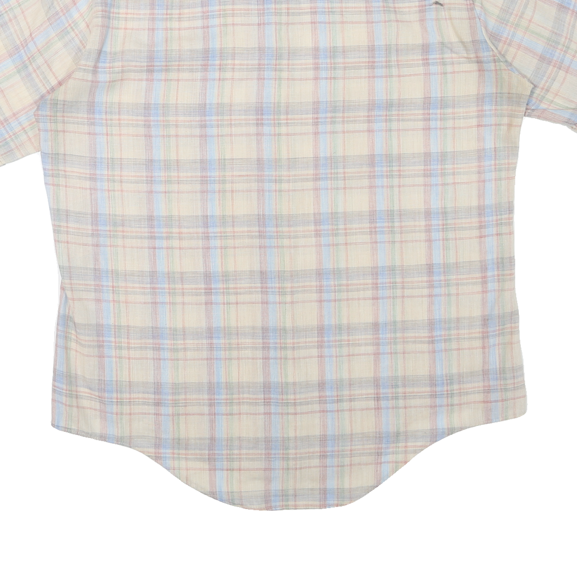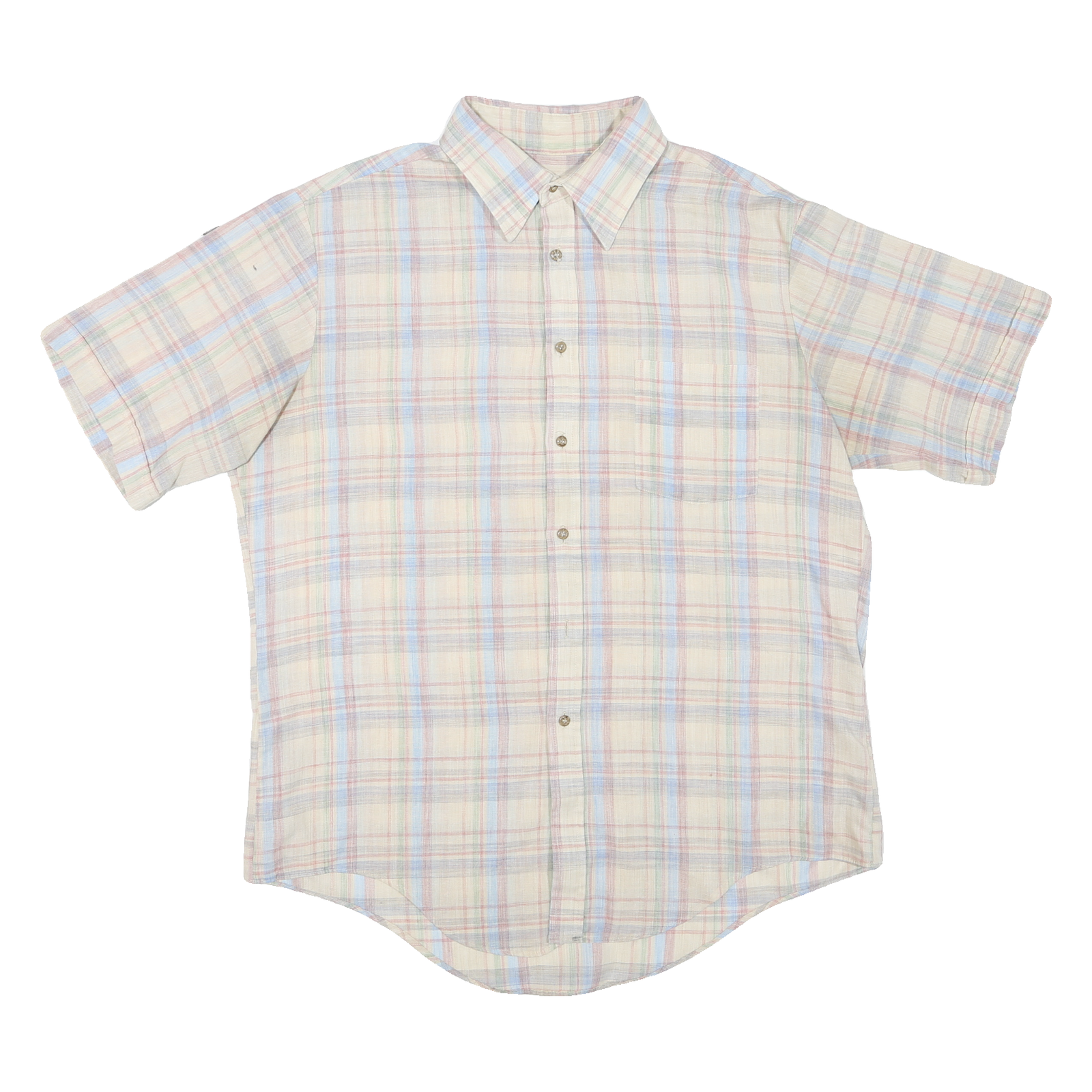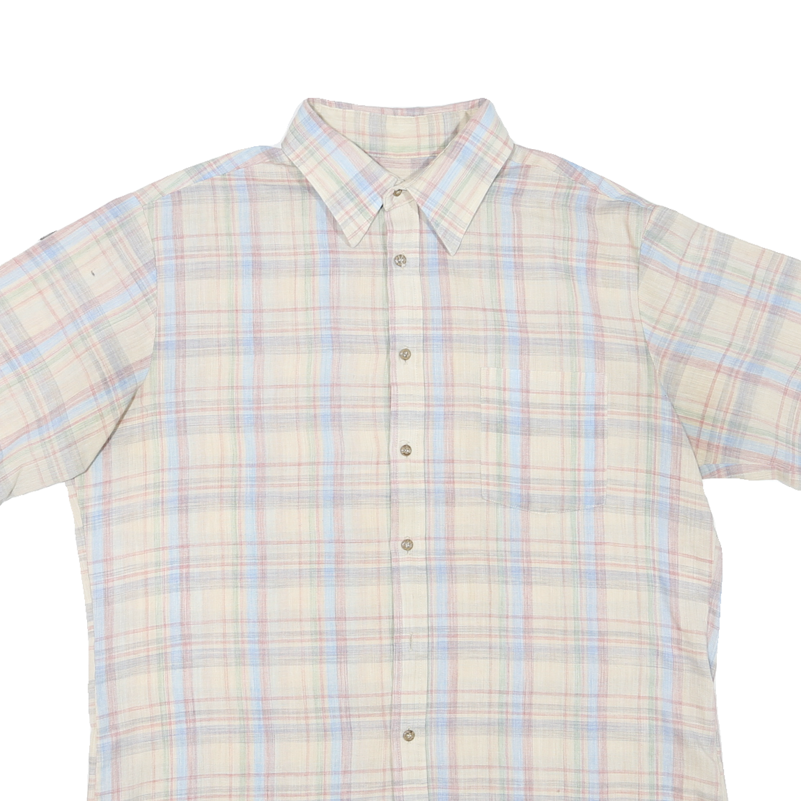 This mens shirt features a classic check pattern in soft white with blue and subtle pastel red lines, creating a light and versatile look. It has a traditional point collar and short sleeves, ideal for warm weather or casual wear. The front has a neat button closure and a single chest pocket for a practical yet stylish touch.