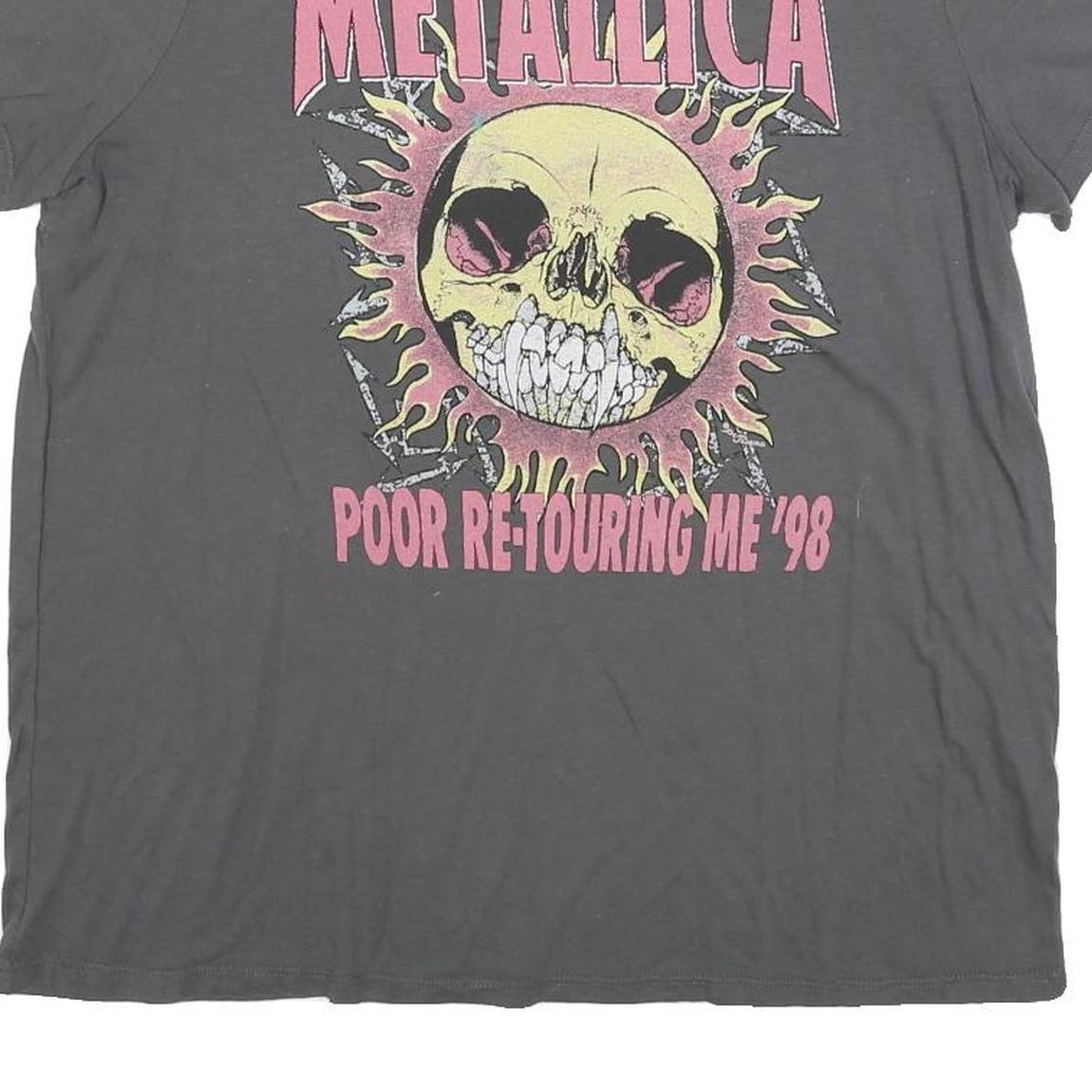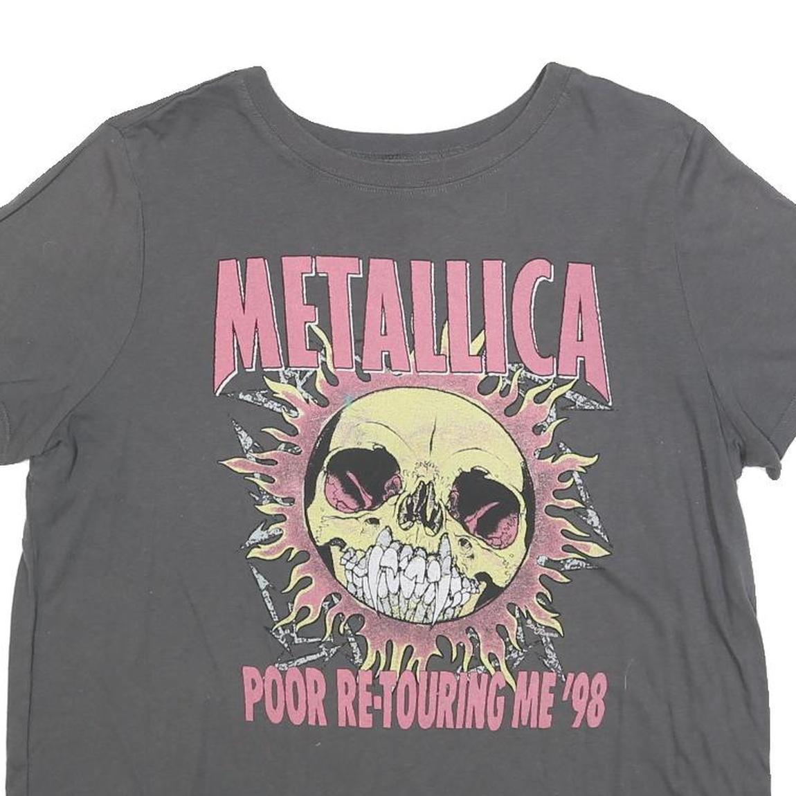 This Metallica womens T-shirt features a faded grey colour with a large vintage graphic on the front. The print shows the band name METALLICA in bold pink letters above a yellow skull with pink eye sockets surrounded by flames and the text 'Poor Re-Touring Me '98' below. The back is plain grey.
