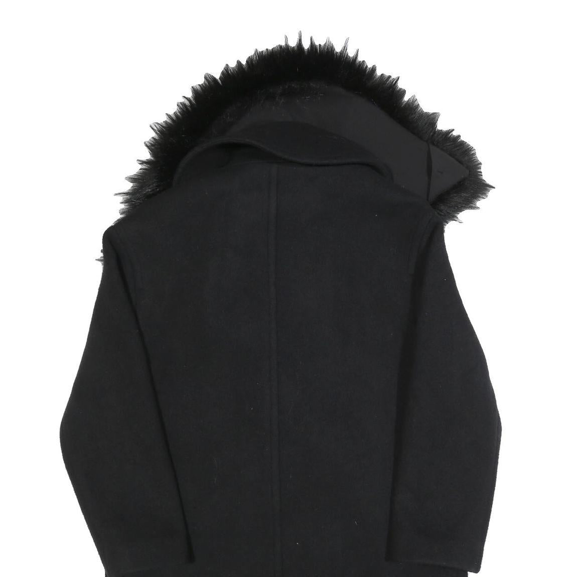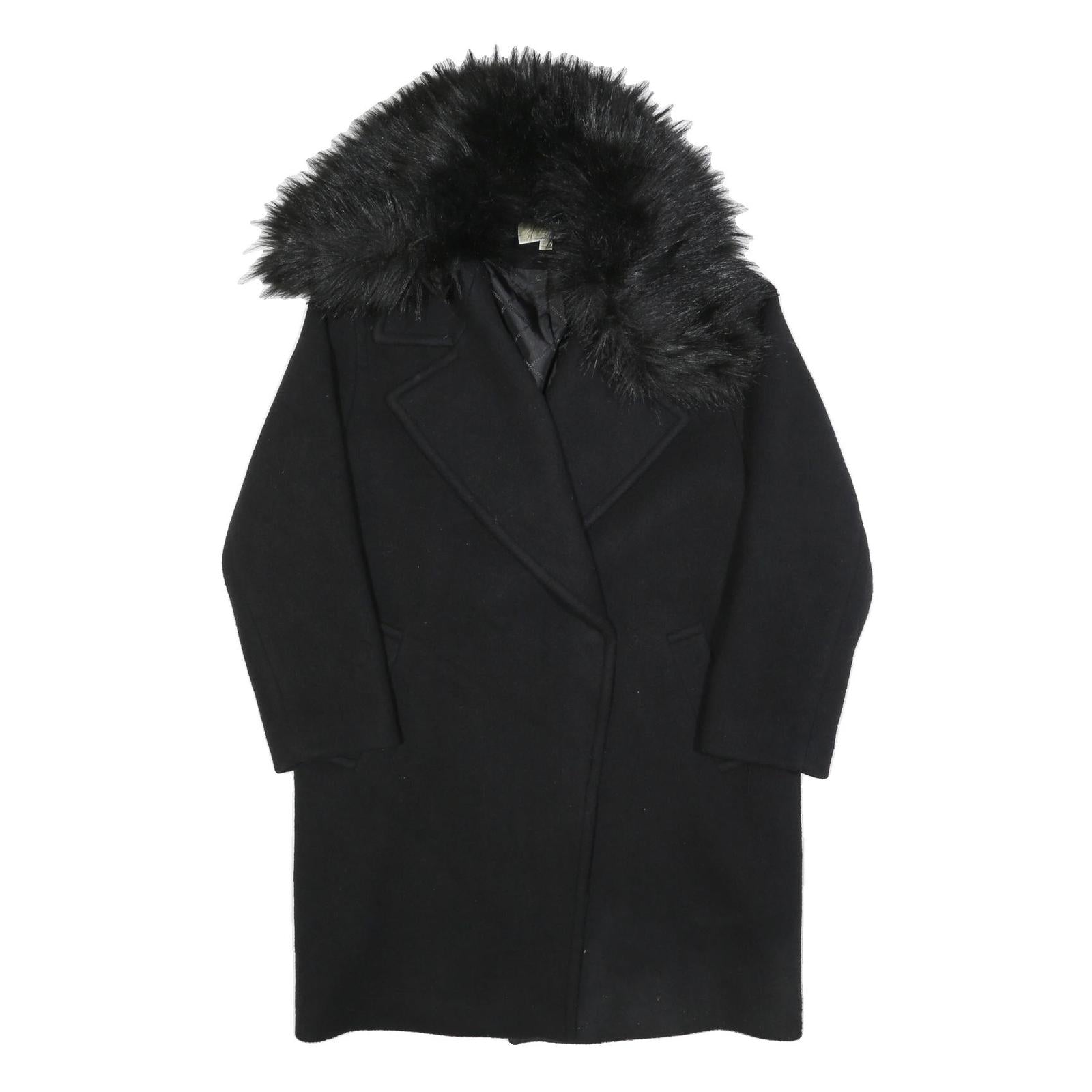 This Michael Kors womens jacket is crafted from a luxurious wool blend in a classic black colour. It features a large, soft faux fur collar adding a touch of elegance and warmth. The jacket has a button front closure and two discreet front pockets.