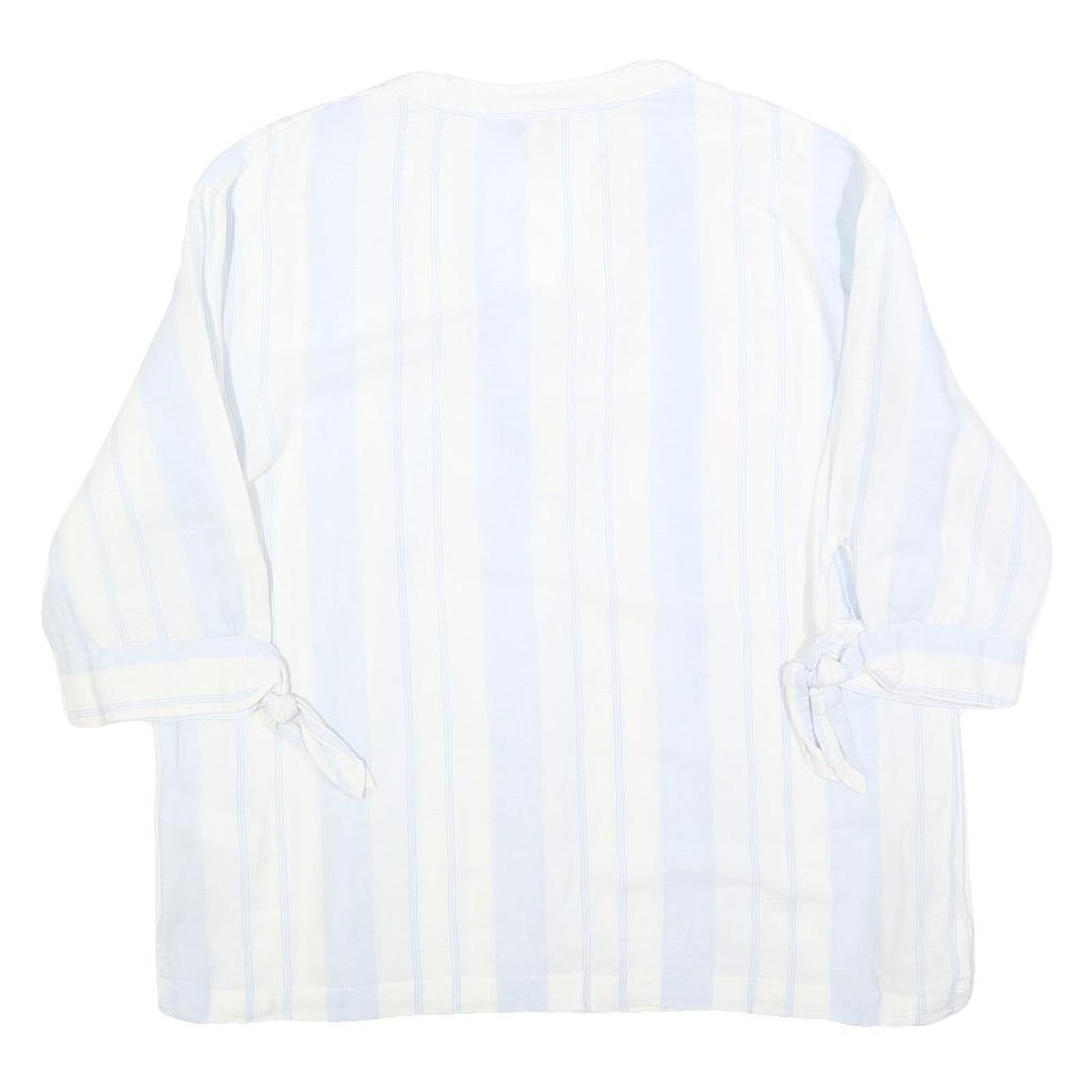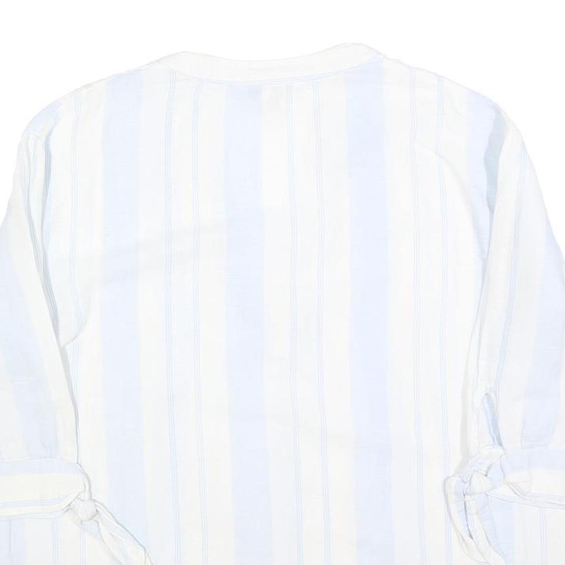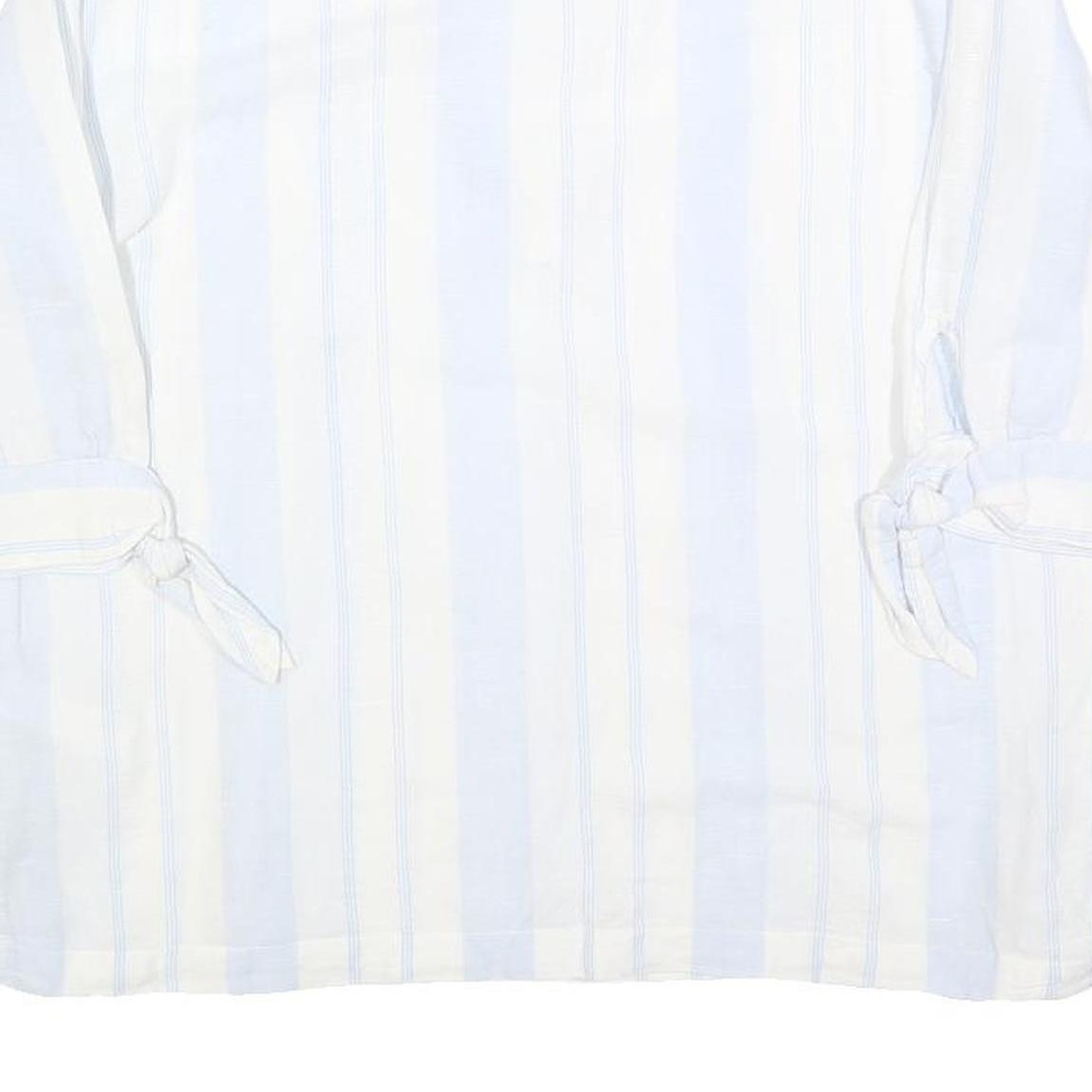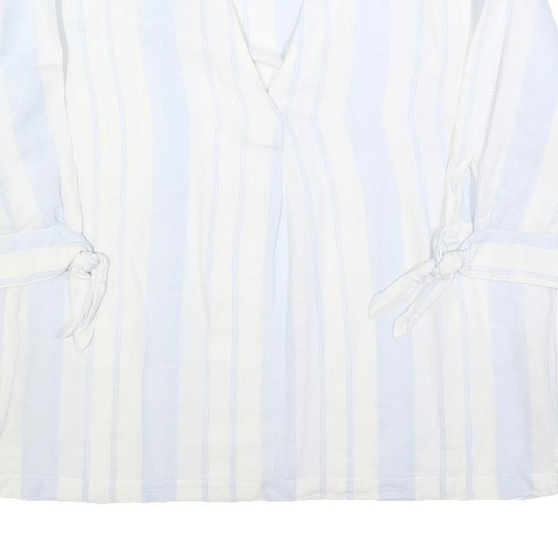 This MONSOON womens top features a fresh white base with soft blue vertical stripes, creating a light and airy printed design. The V-neckline and subtle collar notch add a touch of elegance, while the 3/4 length sleeves end in delicate tie details for added style. The top has a relaxed fit and a comfortable length.