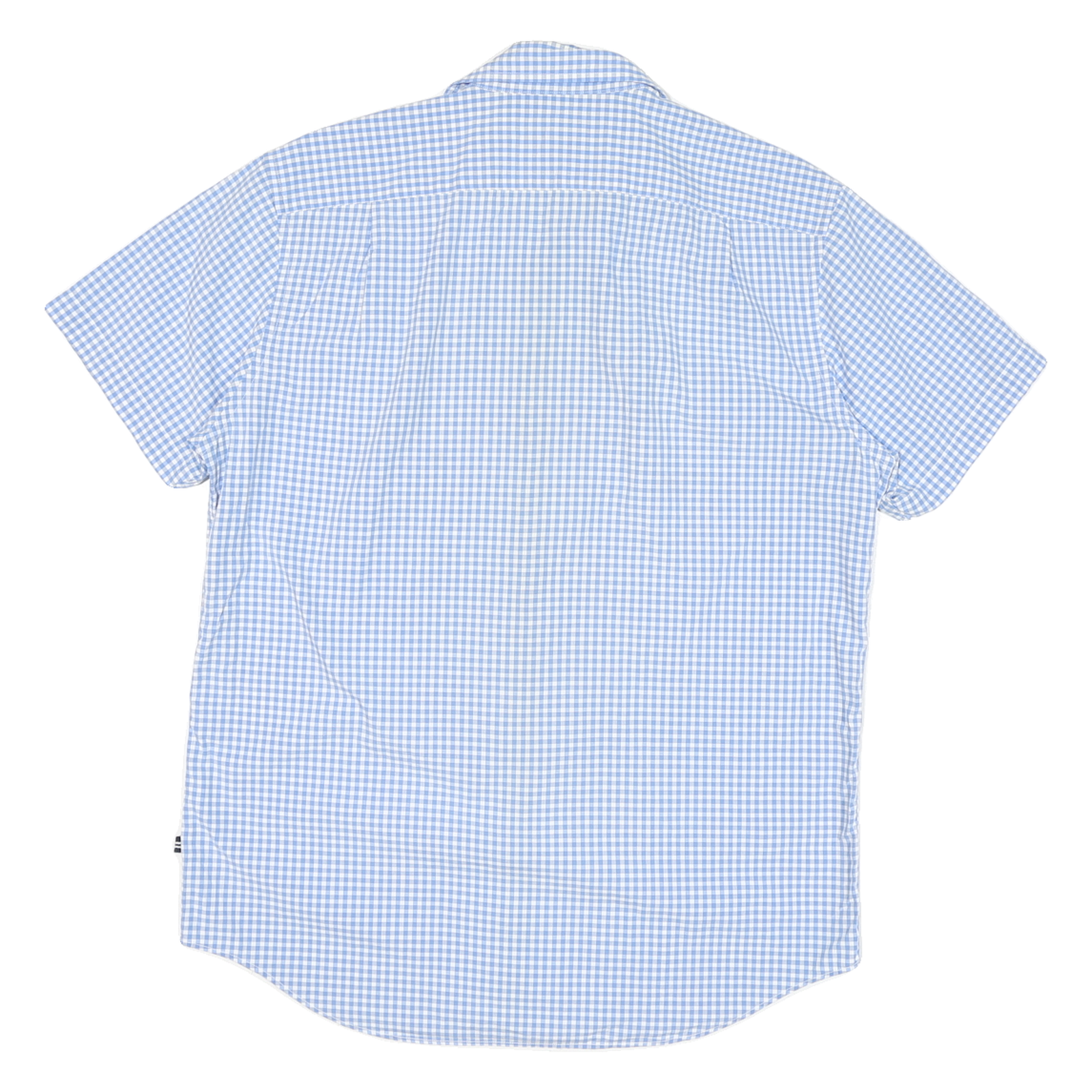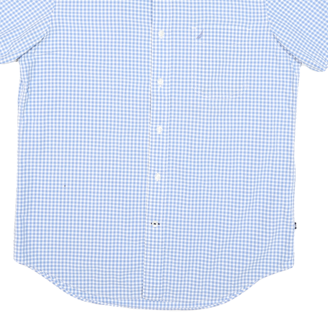 This Mens Nautica short sleeve shirt features a classic blue and white check pattern, giving it a fresh, summery look. The shirt has a traditional point collar and a front chest pocket with subtle Nautica sailboat branding embroidery, adding a refined touch. The check pattern is consistent all over the shirt, including the back.