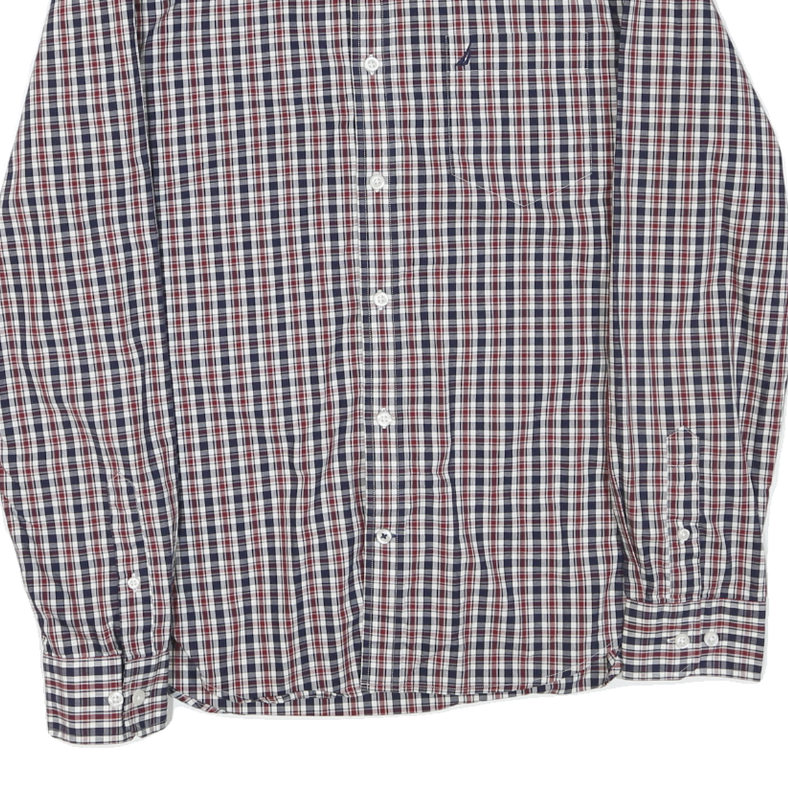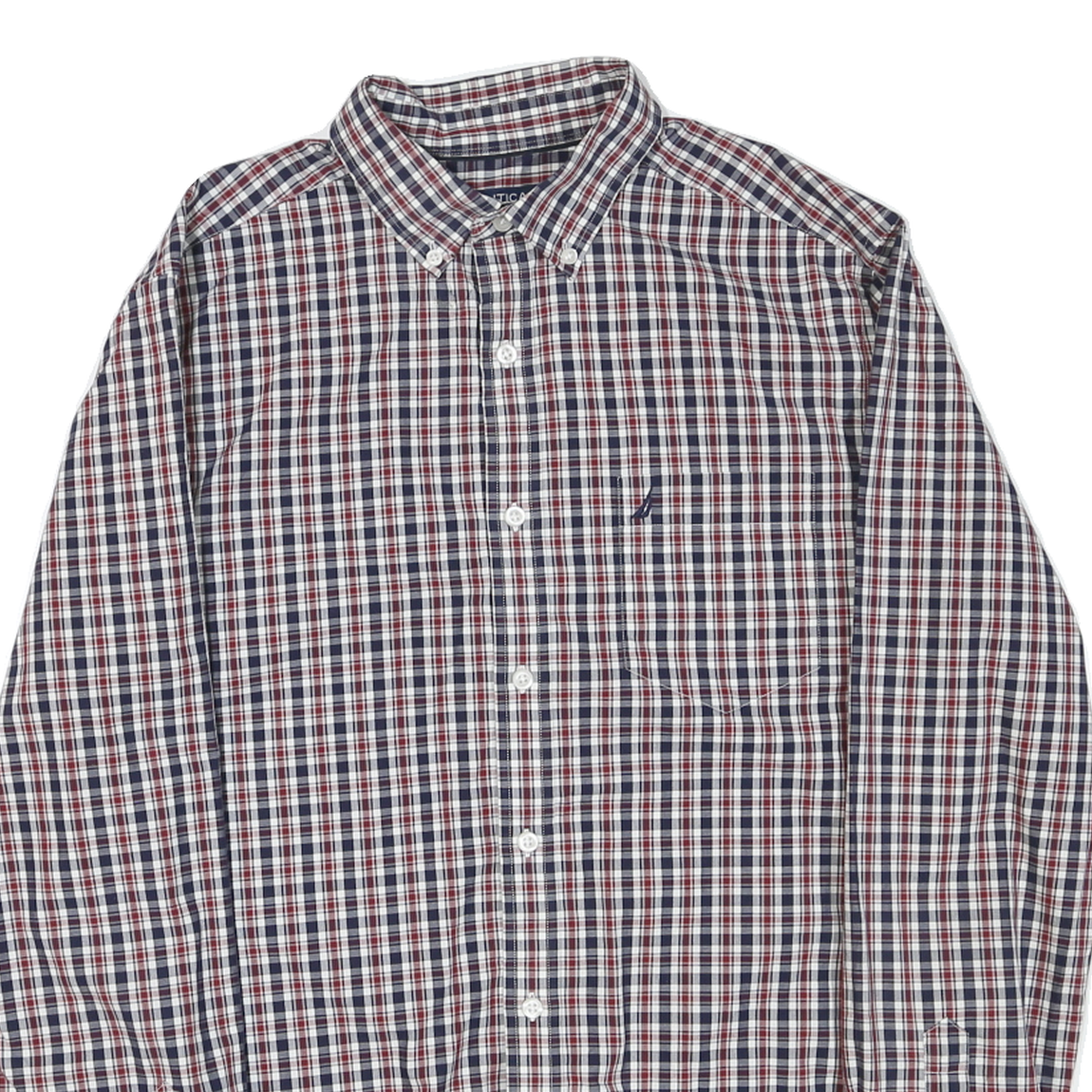 This Nautica mens shirt features a classic check pattern in blue, red, and white tones, presenting a timeless casual style. The Nautica logo is subtly embroidered on the chest pocket in navy blue, adding brand detail without overpowering the pattern.