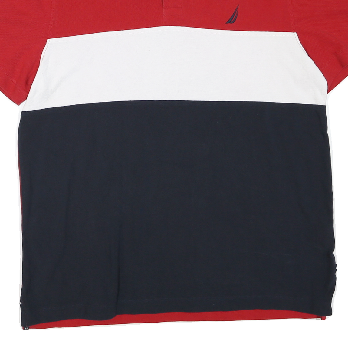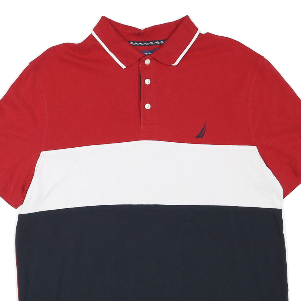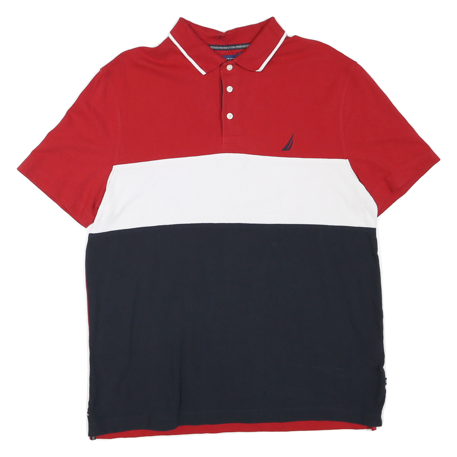 This Nautica mens polo shirt features bold horizontal colour blocking in red, white, and navy, creating a striking and classic aesthetic. The shirt is branded with the iconic Nautica sail logo embroidered on the chest. Its polo collar is detailed with white tipping, and it fastens with a three-button placket.