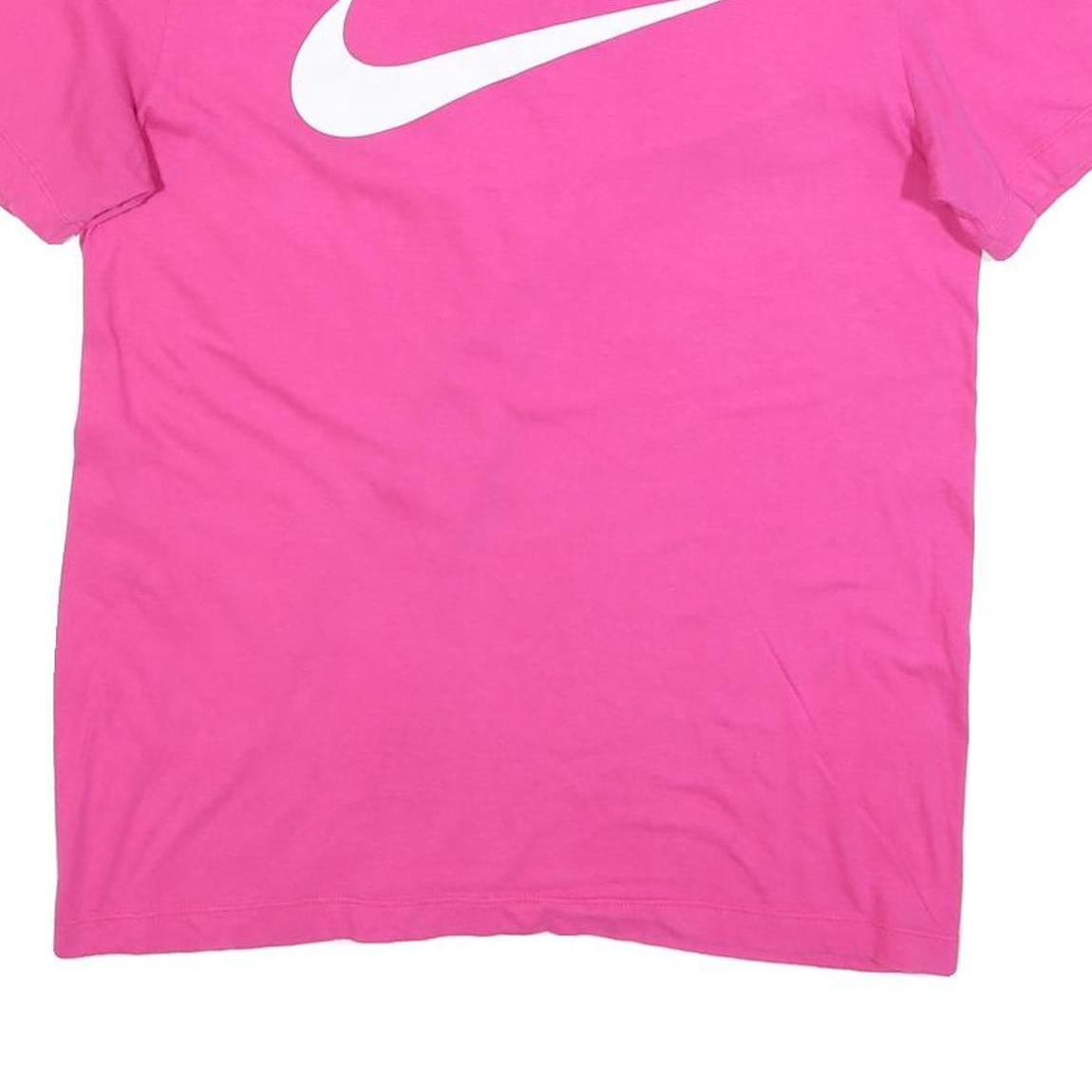 This Nike Mens T-Shirt features a vibrant pink colour with a large white Nike swoosh logo prominently displayed on the front. The t-shirt is plain at the back, showcasing a simple yet bold design.