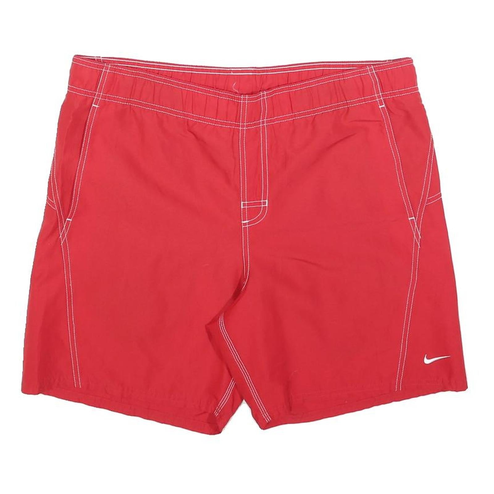 These Nike mens shorts are crafted from polyester and presented in a striking red colour with contrasting white stitching that adds a sporty detail. The iconic Nike swoosh logo is positioned on the front leg hem and the rear waistband, providing subtle brand recognition.