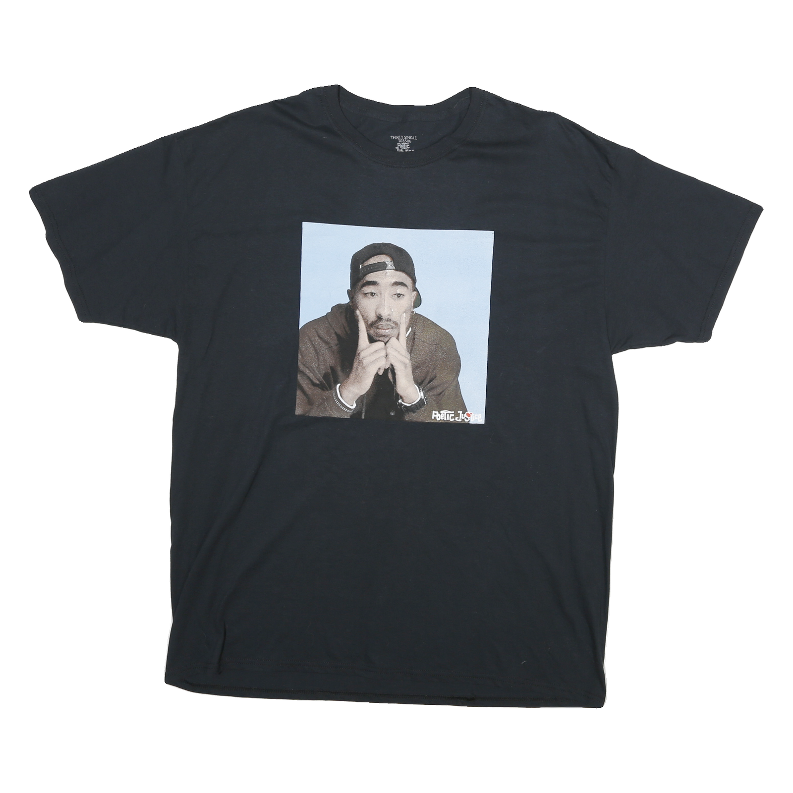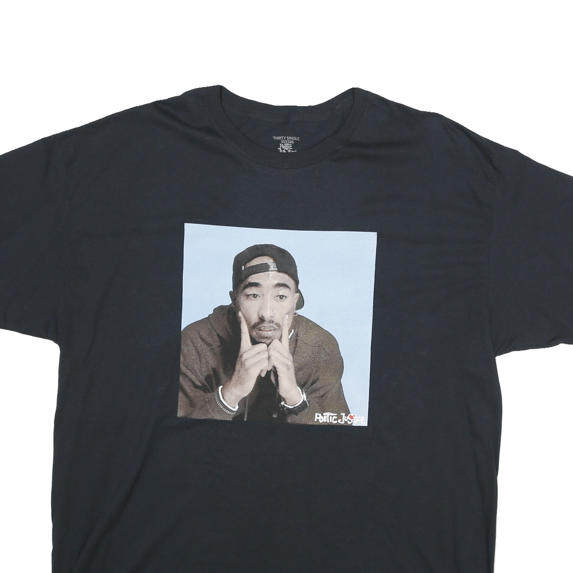 This men's T-shirt from ROTIC JUSTICE features a black colour and a prominent graphic print on the front showing a person wearing a cap and posing thoughtfully. The print is set within a square frame with "Poetic Justice" text in the bottom right corner of the graphic. The rest of the T-shirt is plain black with no visible branding on the back.