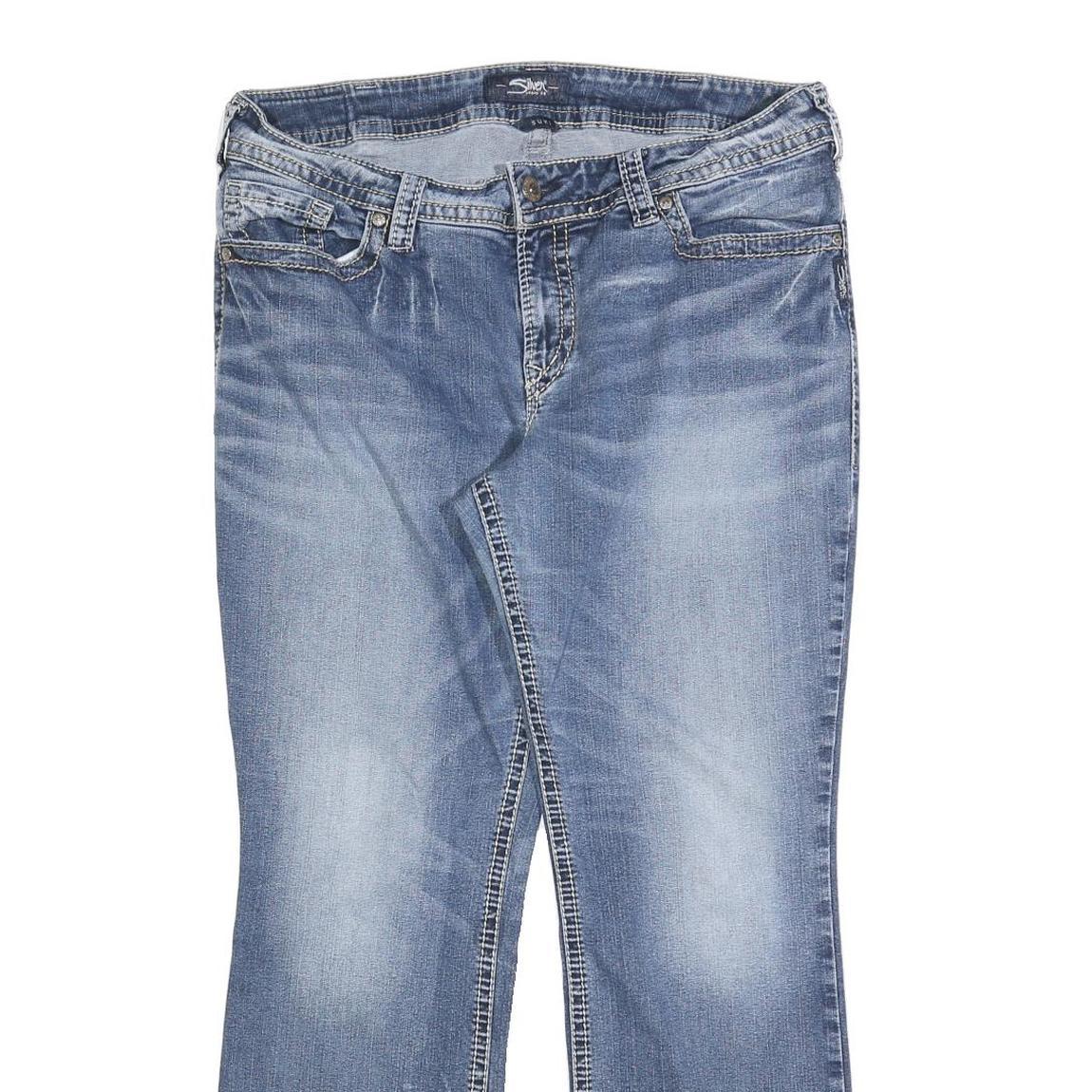 These SILVER JEANS womens jeans come in a medium blue denim with a light wash effect creating subtle fading along the thighs and knees. The classic five-pocket design includes detailed stitching on the back pockets and a branded leather patch on the waistband, enhancing their stylish appearance.