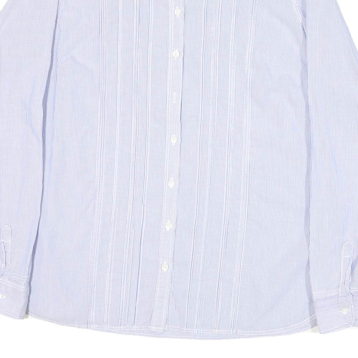 This Tommy Hilfiger womens shirt features a delicate blue and white narrow stripe pattern that runs vertically across the fabric. The front showcases fine, subtle pin-tucking details adding elegant texture to the classic striped design. It has a traditional button-down collar and white buttons along the front placket.