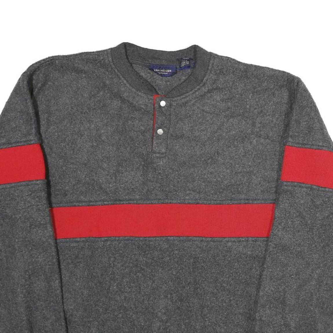 This VAN HEUSEN mens jumper features a charcoal grey body with bold red stripes wrapped around the chest and upper arms, creating a distinctly sporty and casual look. It has a round neckline with a short two-button placket highlighted by red fabric trim. The jumper offers ribbed cuffs and hem for a snug fit.
