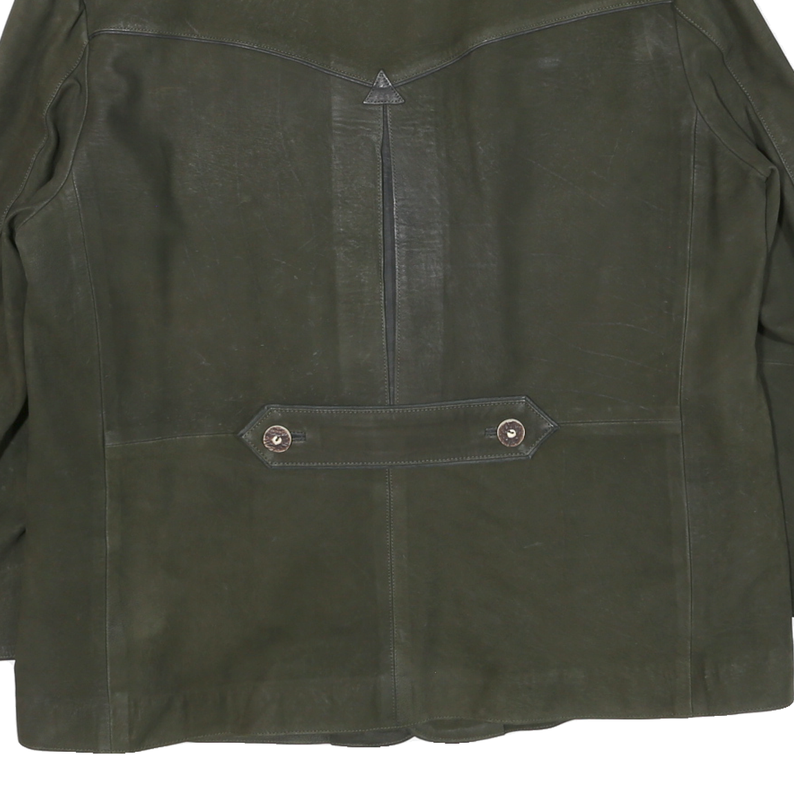 The jacket has a relaxed fit with long sleeves and a collarless neckline. It offers a unique vintage style, evident from button placements on the front and cuffs, plus tailored panels on the back. The leather material provides durability and a smooth, soft feel.