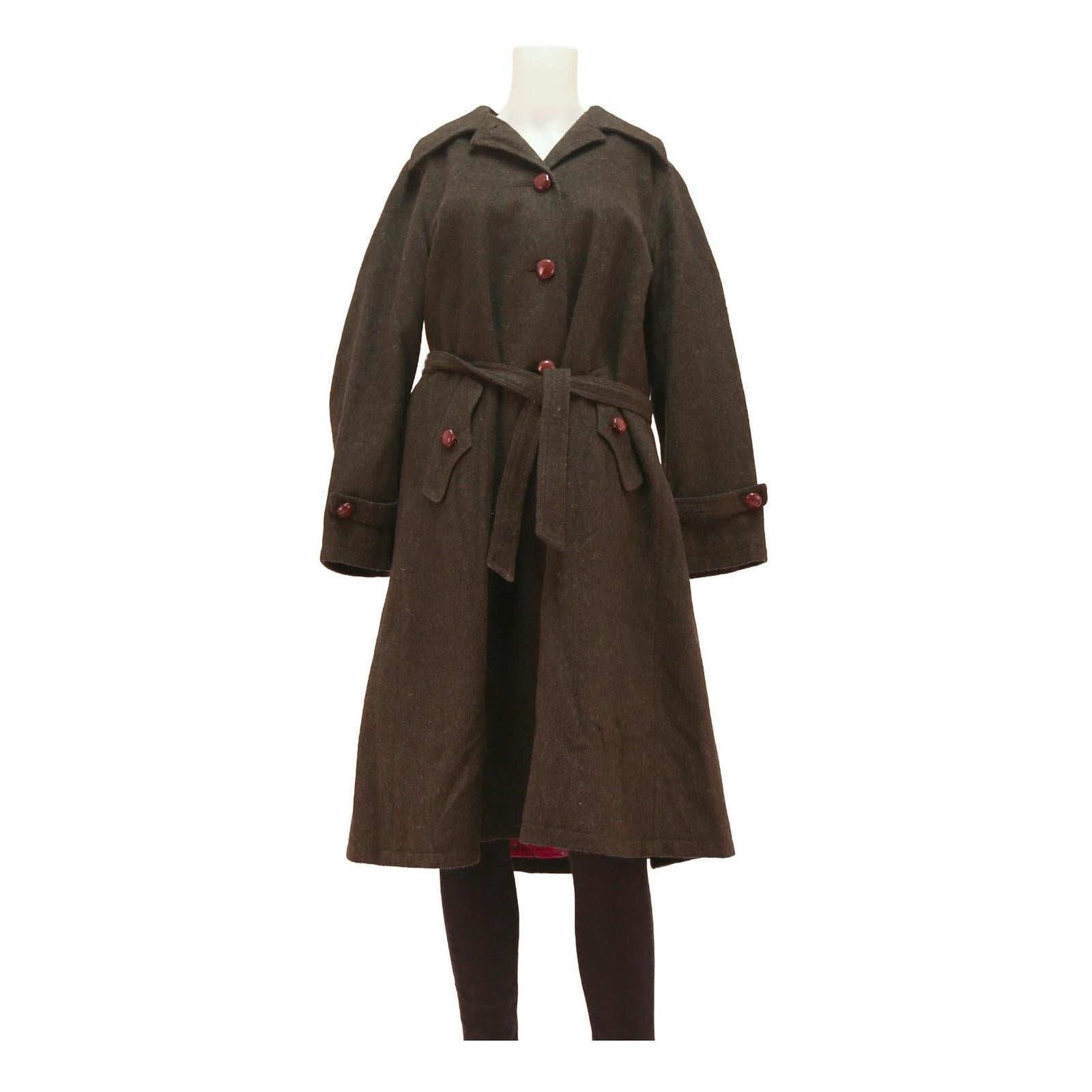 This womens jacket is crafted from a warm wool blend in a rich brown colour. It features a button front closure with large, matching buttons and a classic collar design. The jacket includes a detachable belt at the waist and flap pockets with button details on the hips.
