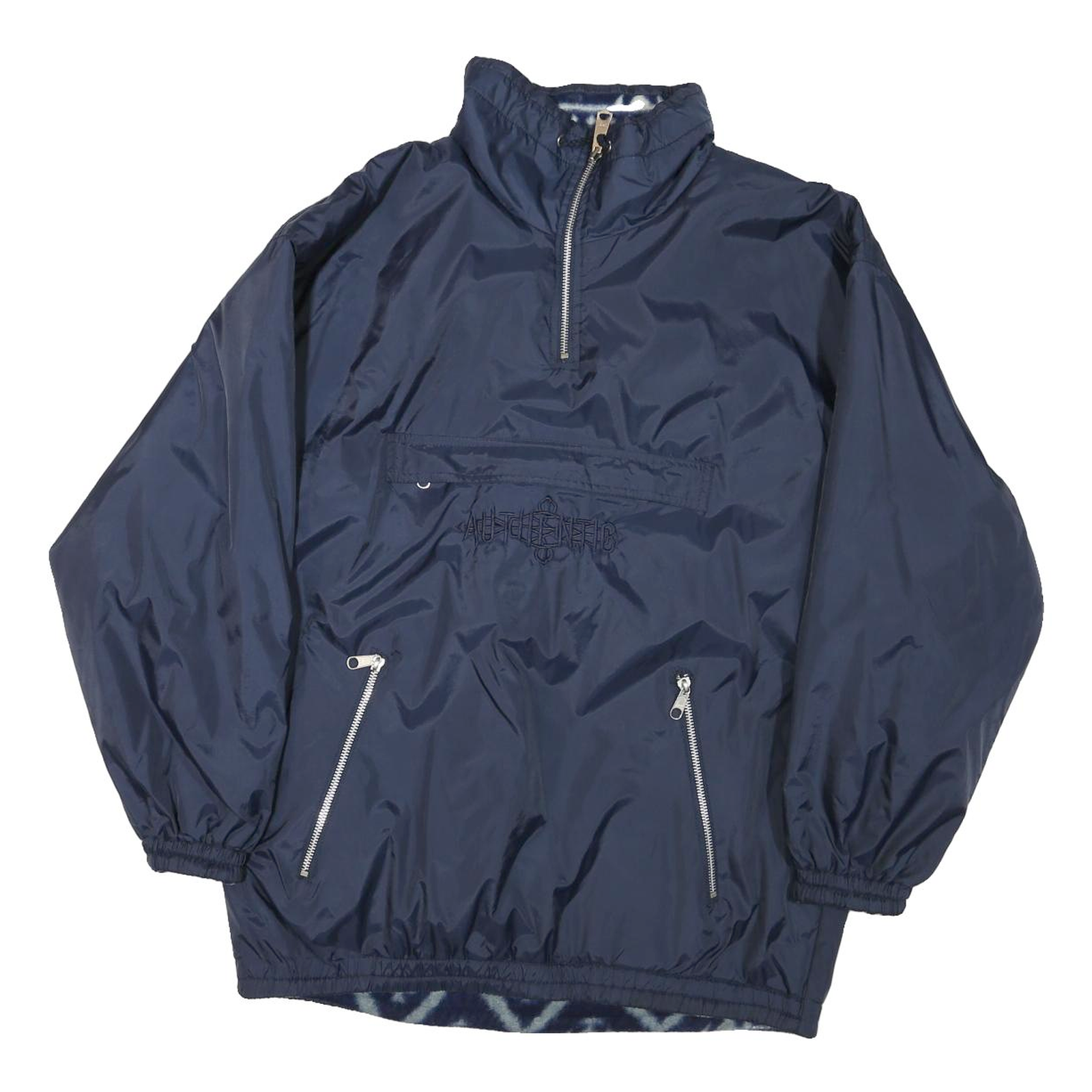 This womens jacket is crafted from navy blue nylon, designed to be reversible for versatile styling options. It features a half-zip front closure and an elasticated high collar that provides extra neck coverage. The front showcases a unique embroidered graphic logo along the chest pocket, adding subtle branding detail to the plain design.