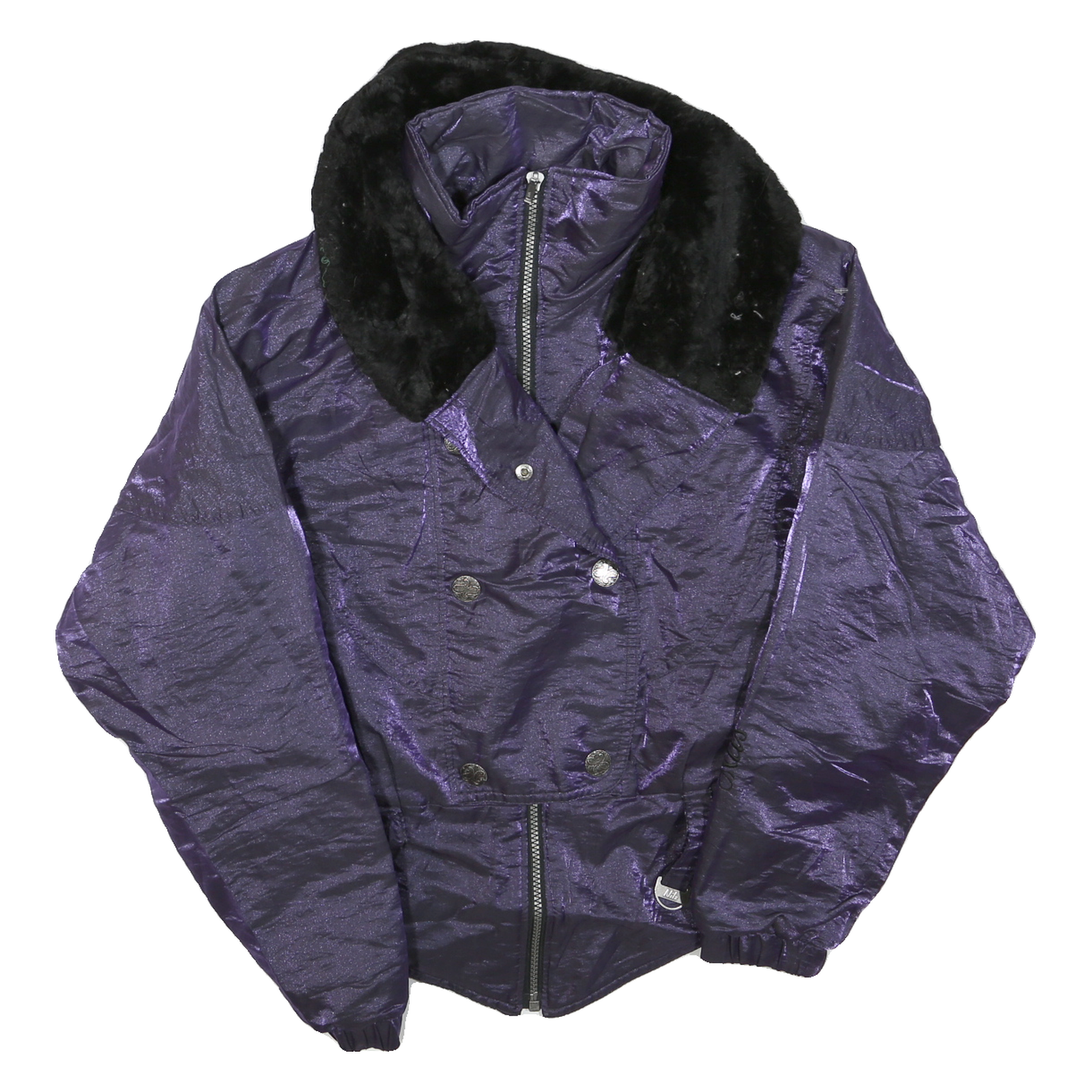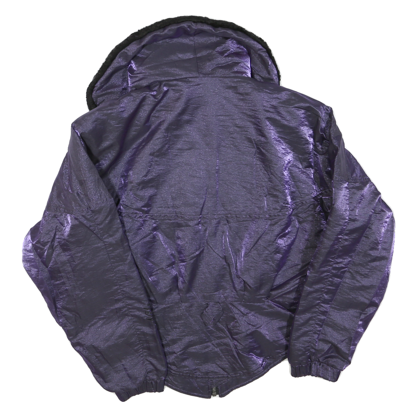 This womens jacket features a striking deep purple colour with a contrasting black faux fur collar that adds texture and warmth. The jacket is crafted from a polyester blend fabric that provides a smooth, slightly shiny finish, making it suitable for cooler weather and casual winter wear.