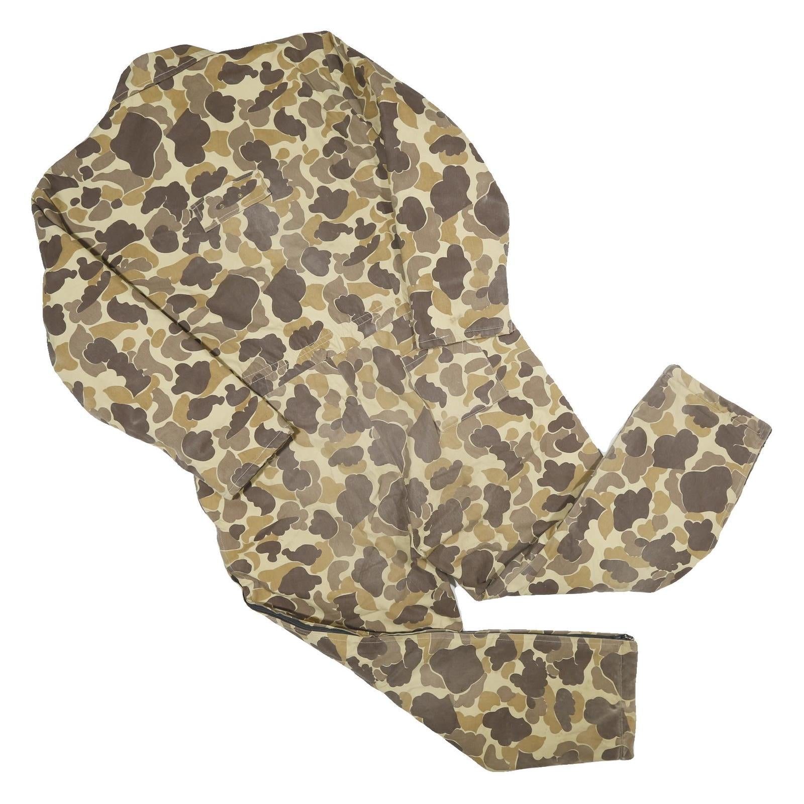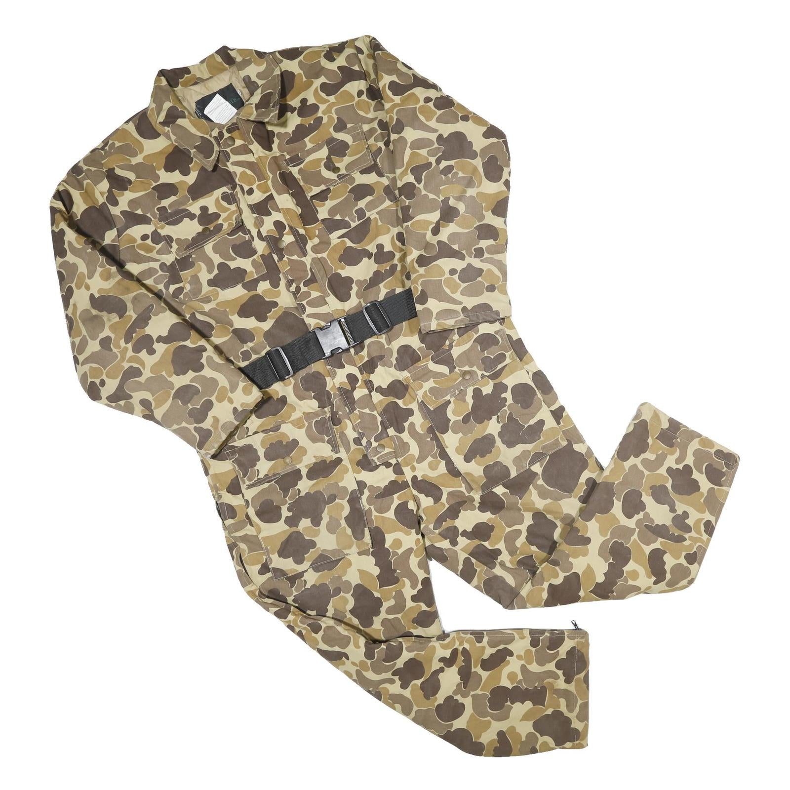 These Woodland dungarees feature a distinctive beige camouflage pattern with shades of brown and tan, giving a rugged and utilitarian look suitable for work or casual wear. They have a classic collar and long sleeves, with multiple chest and side pockets providing practical storage options. The waist is adjustable with a black belt, enhancing fit and convenience.