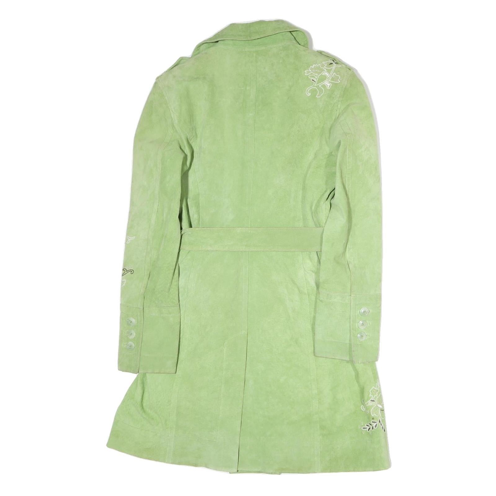 This womens YUPPIE jacket features a soft green cotton blend fabric with elegant white and black floral embroidery on the front, sleeves, and back shoulder. It has a double-breasted button closure and a classic collar, complemented by structured long sleeves with buttoned cuffs.