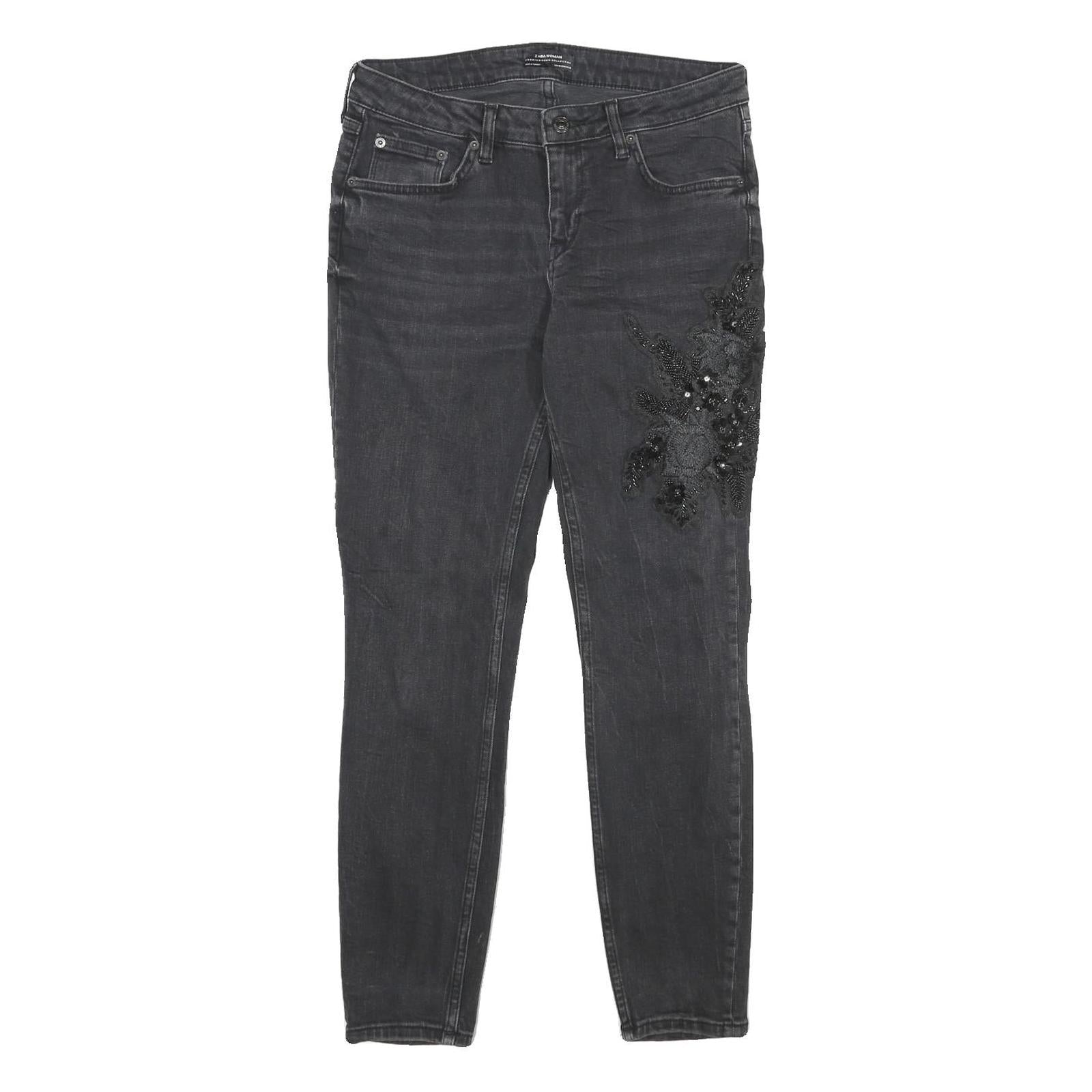 These Womens ZARA jeans feature a sleek black denim appearance with an eye-catching embroidered floral detail embellished with beads on the right thigh. The fabric has a soft cotton blend feel, offering comfort with a slight stretch for everyday wear.