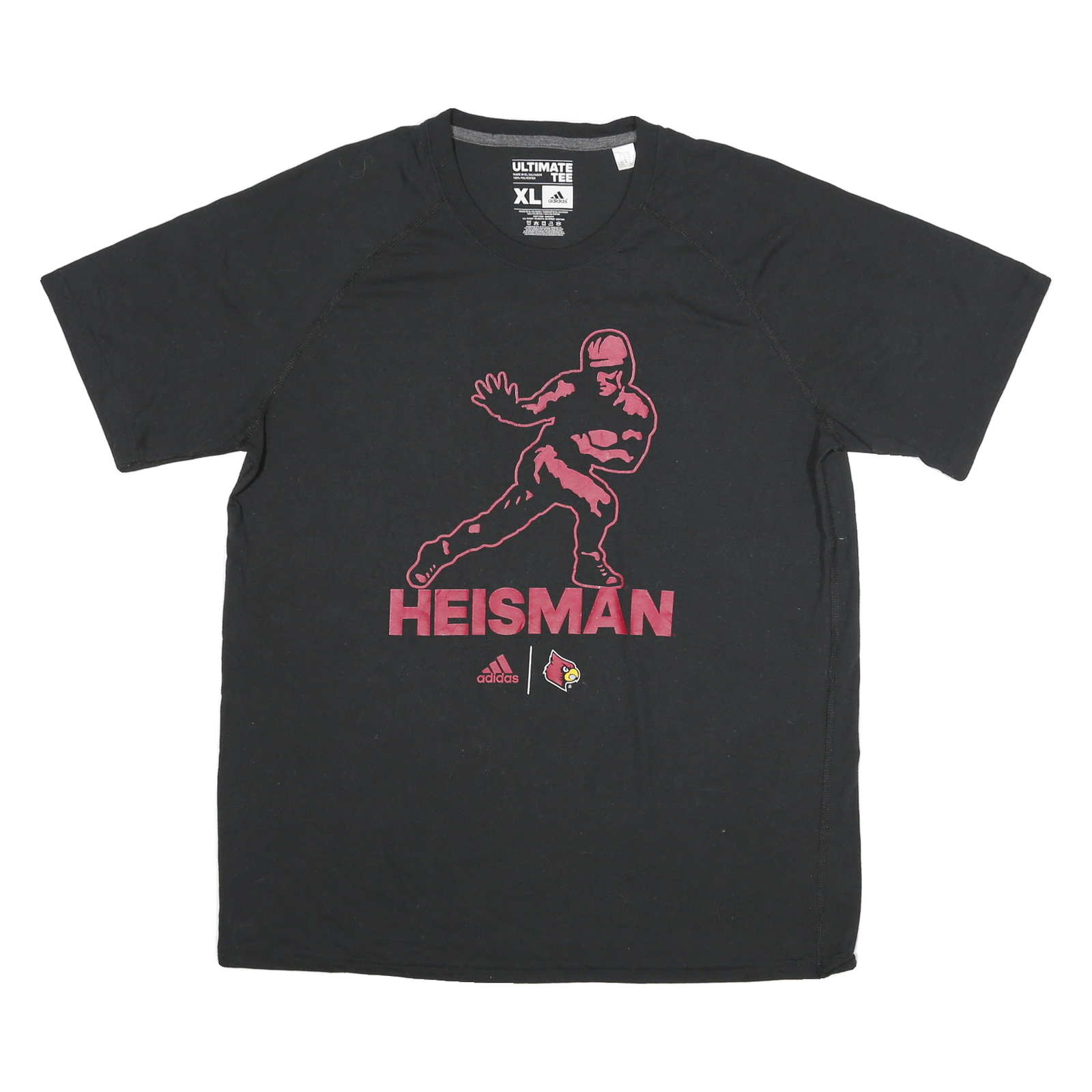This men's Adidas T-shirt features a sleek black base with a bold red graphic depiction of a football player alongside the prominent "HEISMAN" text on the front. The Adidas logo and a collegiate style emblem accentuate the sporty design, offering a distinctive athletic look.