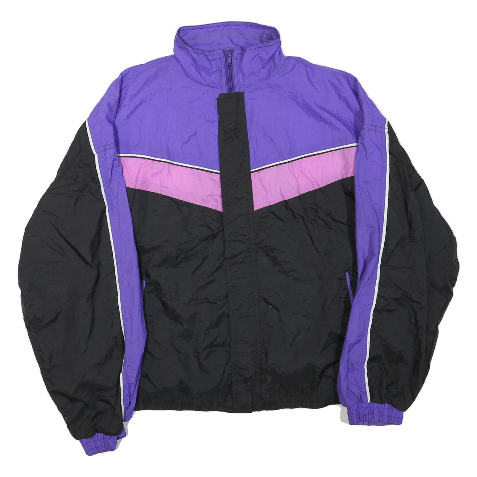 This vintage Algonquin jacket features a striking colourblock design in purple, pink, and black with white piping accents along the sleeves and chest. It has a high stand-up collar and a front zip closure with an additional fabric placket for wind protection. The elasticated cuffs and hem provide a comfortable and secure fit, making it a perfect casual outer layer.