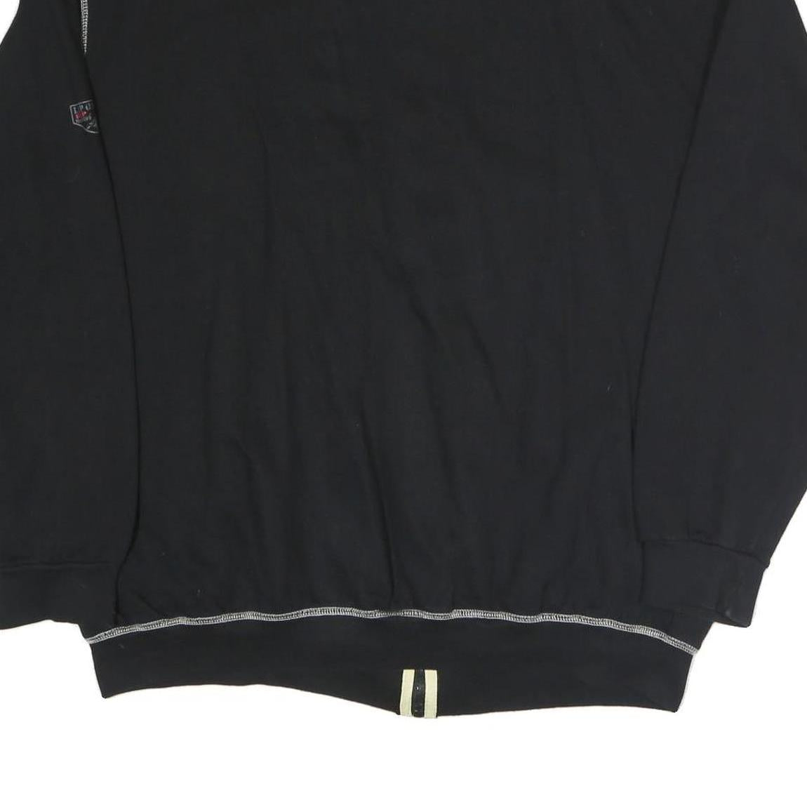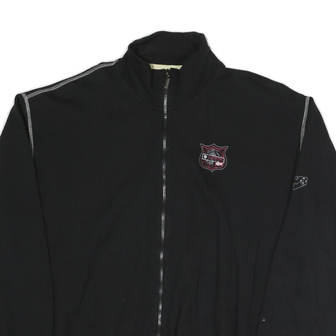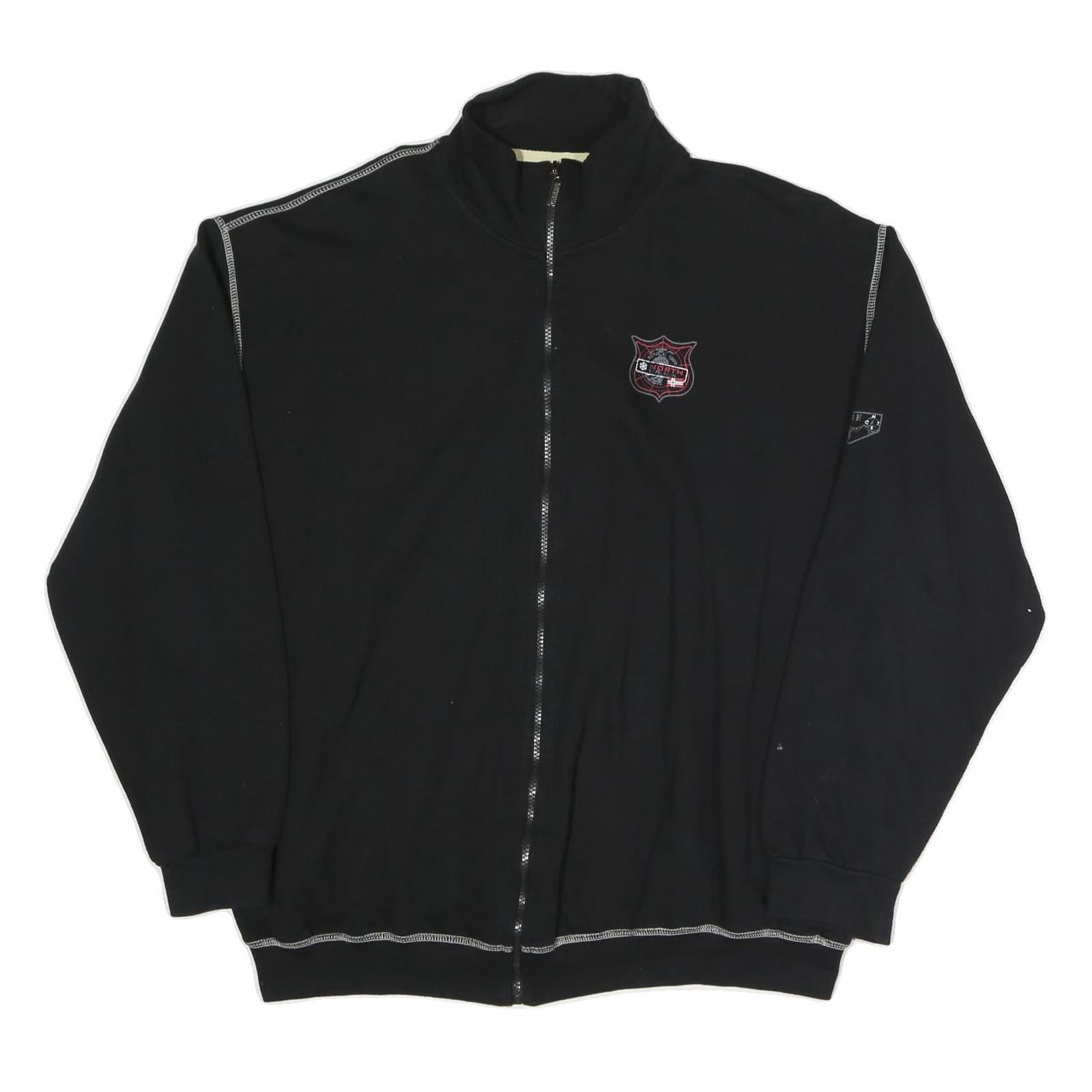 This mens jacket by ATLAS FOR MEN is crafted from a comfortable cotton blend fabric in black. It features contrast white stitching along the shoulders and hem, adding subtle visual interest. The front sports a zip closure for ease of wear and a small embroidered badge emblem on the chest. There is also a smaller patch on one sleeve, enhancing its casual, sporty look.